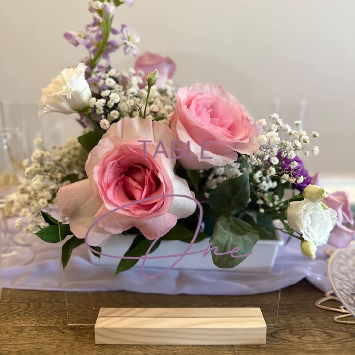 • Clear Acrylic Sign with Wood Base: The glass-like acrylic material is a trendy choice for wedding party decorations. These elegant acrylic wedding table signs will enhance the aesthetic of any table and complement various wedding styles, from rustic to timeless and classic.