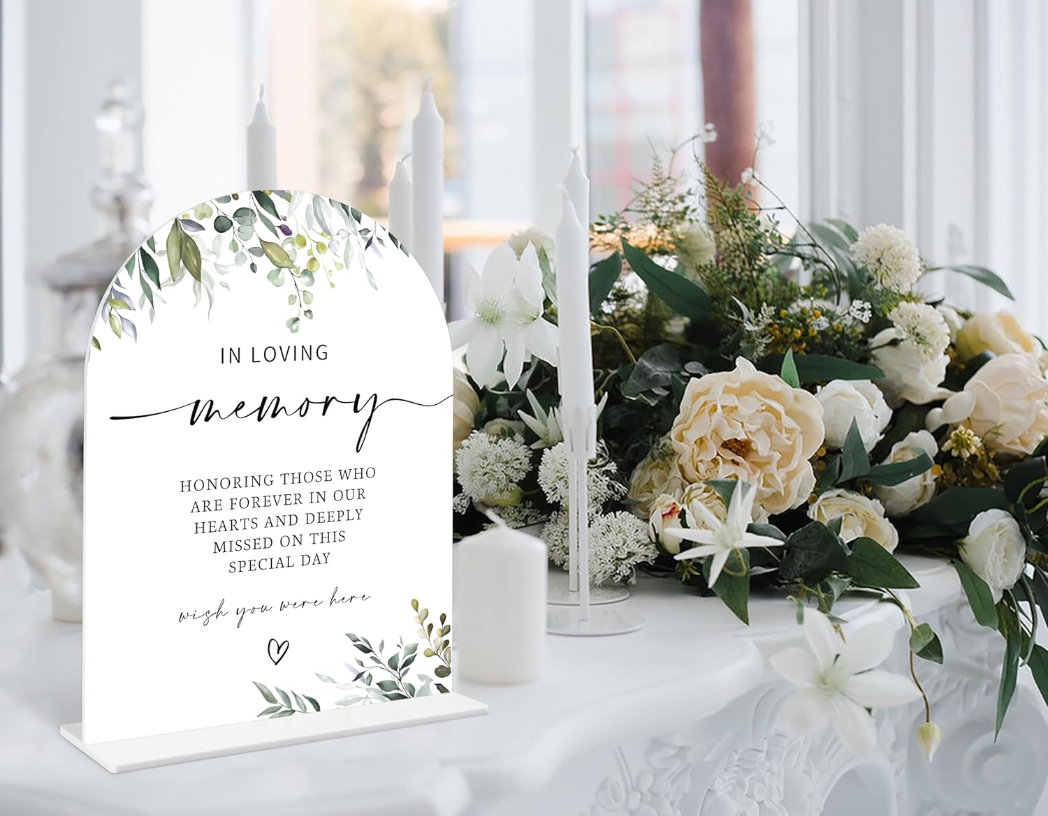 Greenery In Loving Memory Sign, 6 x 8 Inch White Arch Acrylic Wedding Sign with Holder, Wedding Sign for Ceremony and Reception, Wedding Decoration, Wedding Supplies - LY05