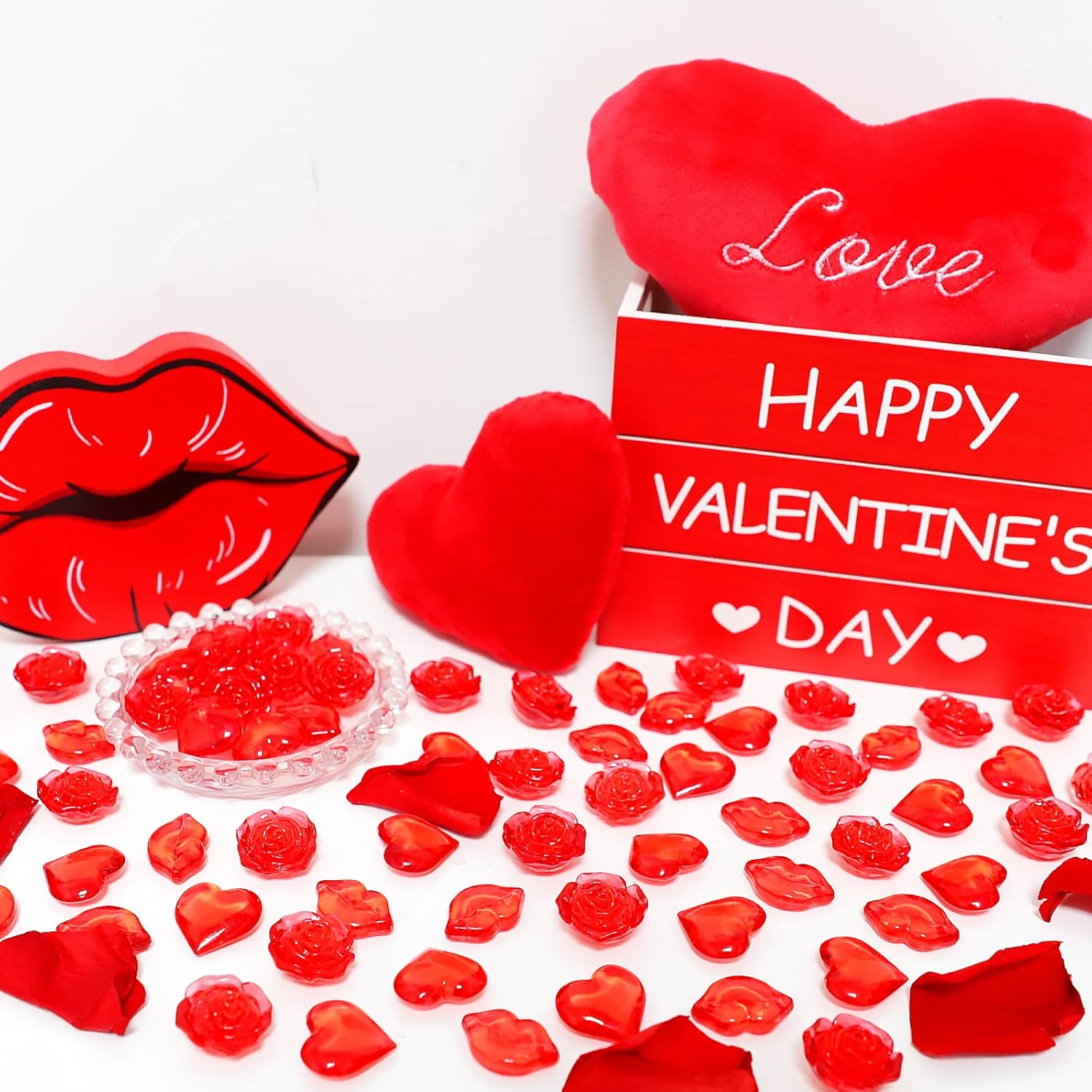 • Valentine's Day Decoration:Lovely red flowers,lips,heart gems are suitable for Valentine's Day desktop decoration,Sprinkle some on the table or around the candles.Adding radiance and charm to your Valentine's Day and party tables