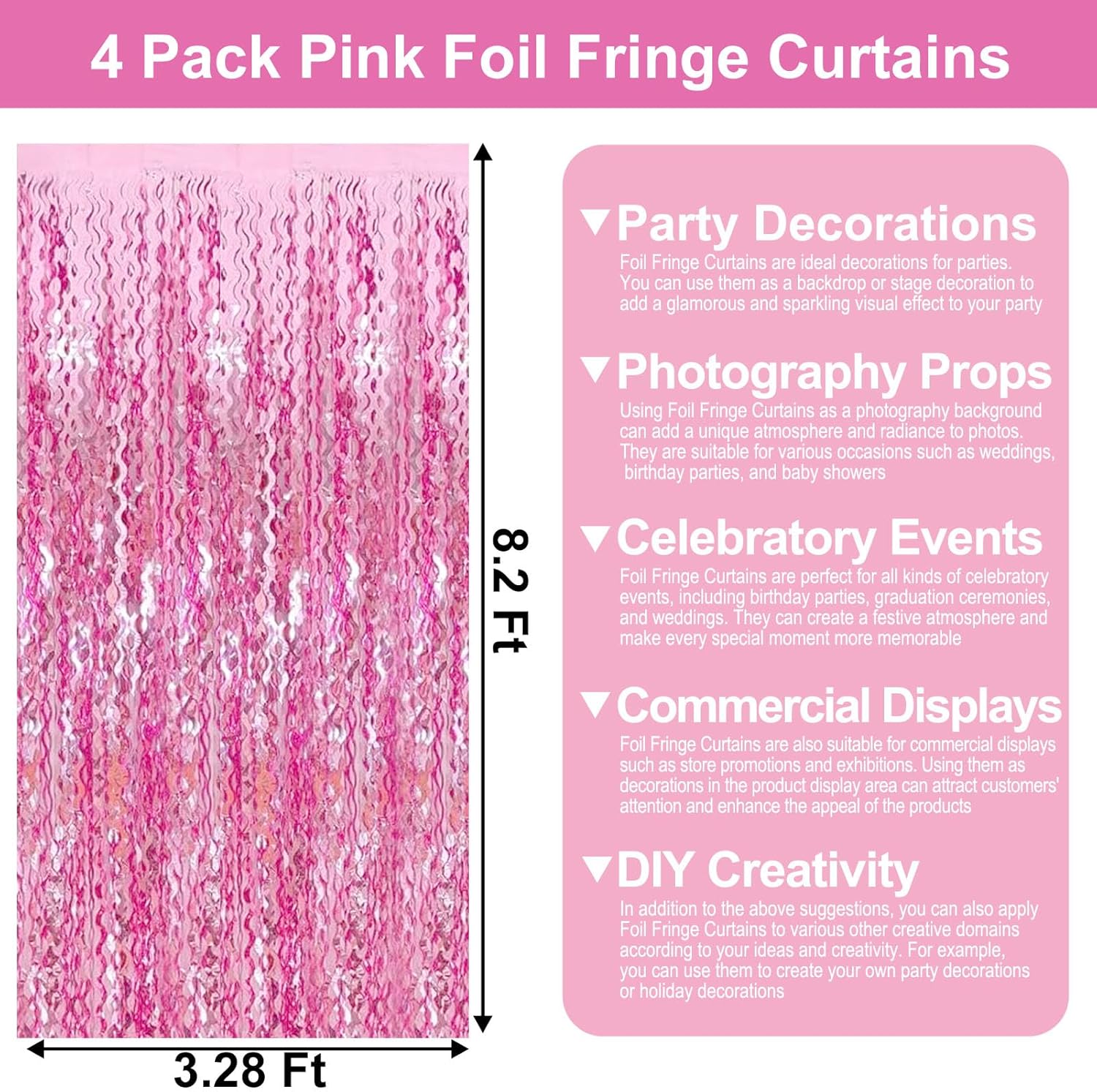 • Widely Applications:The foil fringe backdrop are wonderful finishing touch for any theme party such as birthday party, theme party, Halloween, Christmas, New Year Eve, bachelorette party, wedding, bridal shower, baby showers, graduations Etc.