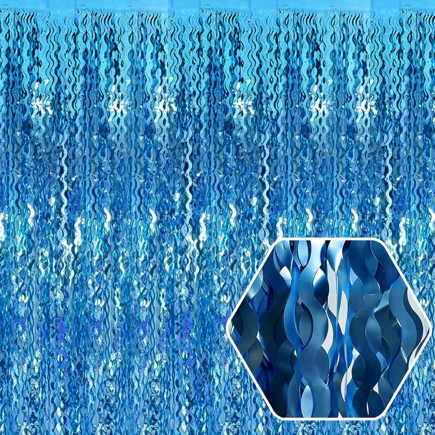 4 Pack Lake Blue Wave Foil Fringe Curtain Backdrop, 3.28Ft x 8.2Ft Metallic Tinsel Foil Fringe Streamer Curtains for Photo Booth, Mother's Day, Easter, Birthday, Wedding Party Decoration