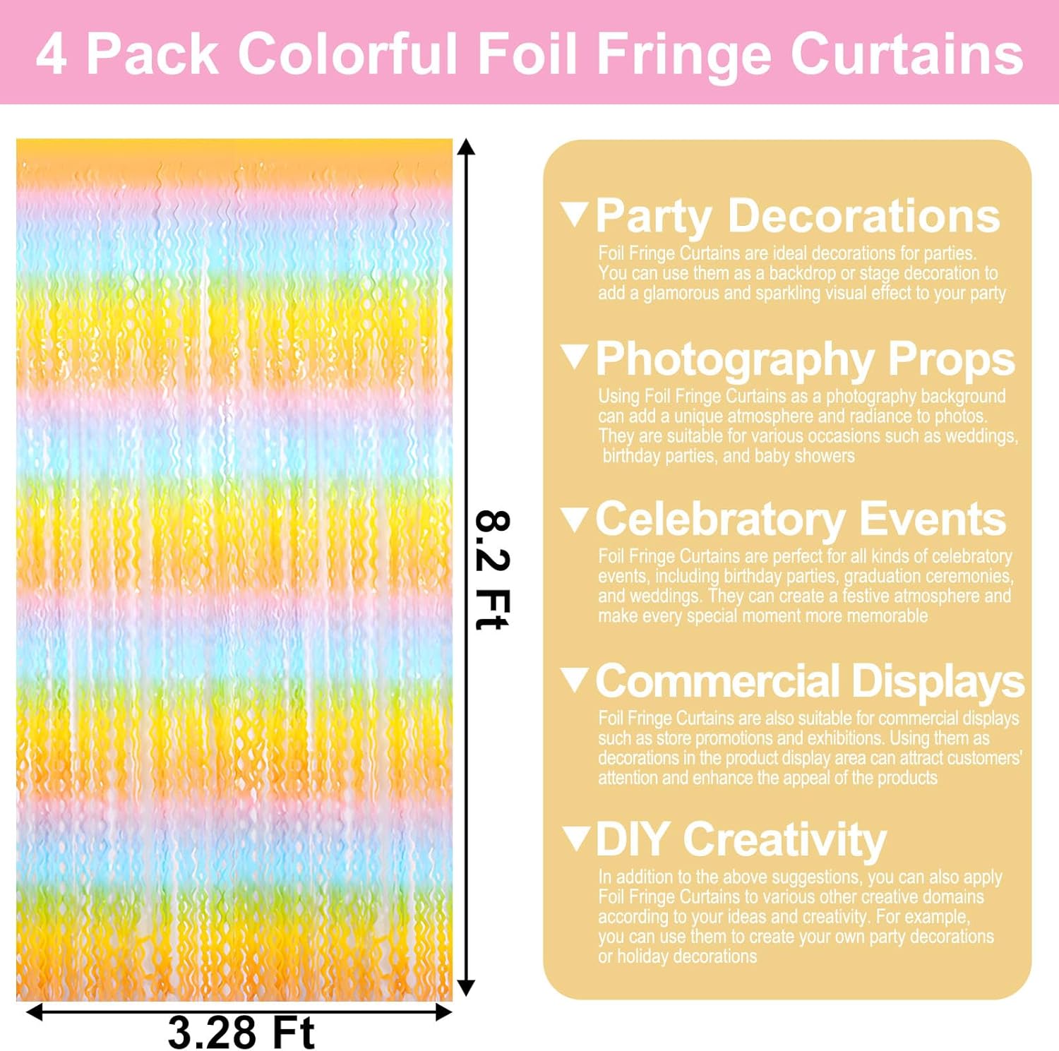 • Widely Applications:The foil fringe backdrop are wonderful finishing touch for any theme party such as birthday party, theme party, Halloween, Christmas, New Year Eve, bachelorette party, wedding, bridal shower, baby showers, graduations Etc.