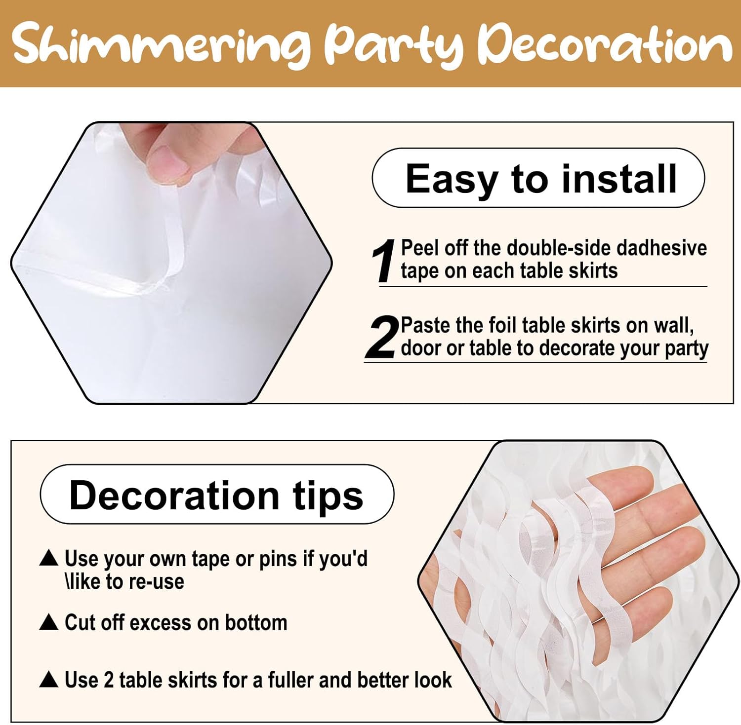 • Reliable quality: Wave the foil-edged table skirt is made of metal foil, which is light and easy to use; They can keep a smooth surface well and are very suitable for your party venue decoration.