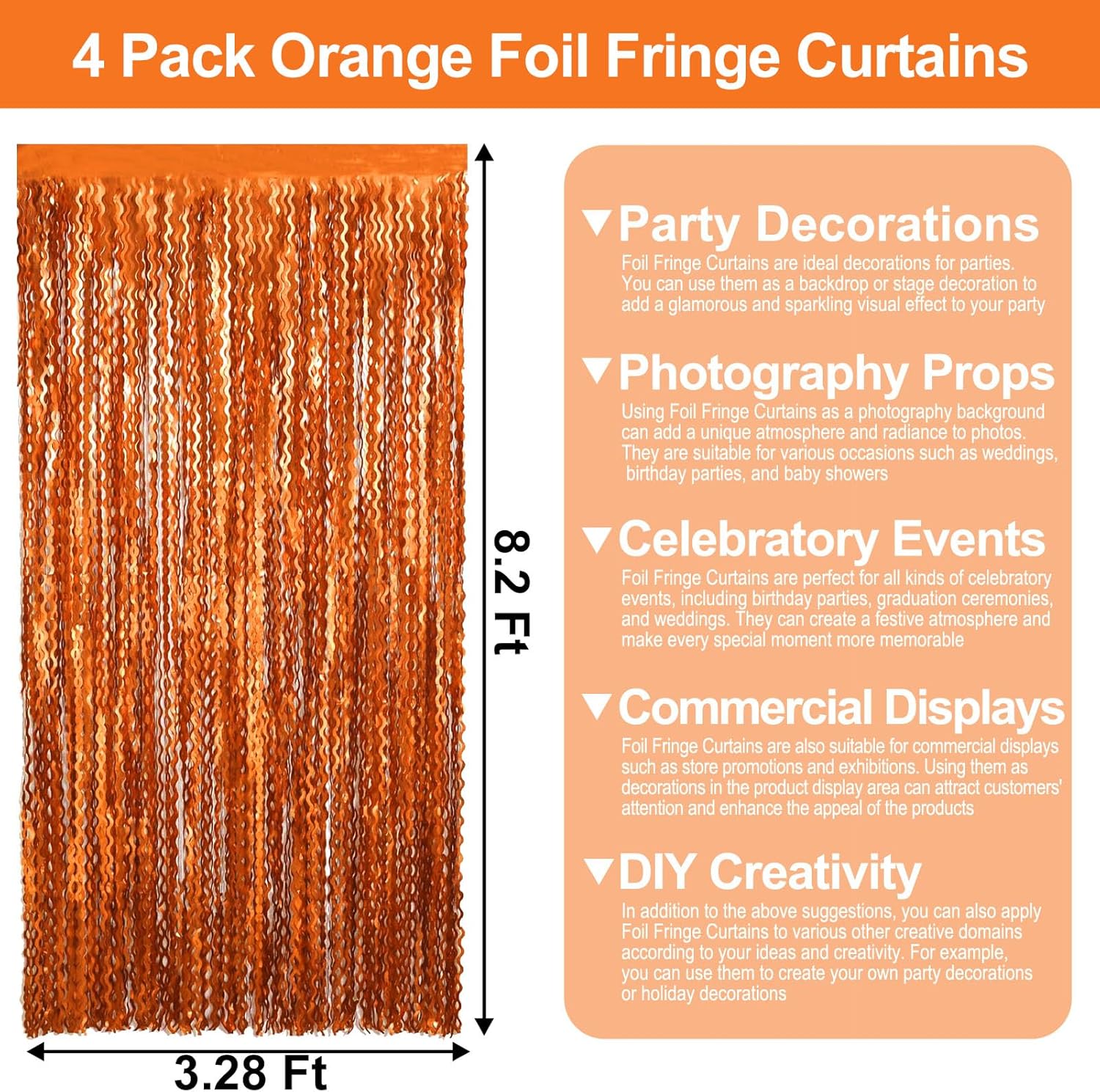 4 Pack Orange Wave Foil Fringe Curtain Backdrop, 3.28Ft x 8.2Ft Metallic Tinsel Foil Fringe Streamer Curtains for Photo Booth, Mother's Day, Easter, Birthday, Wedding Party Decoration