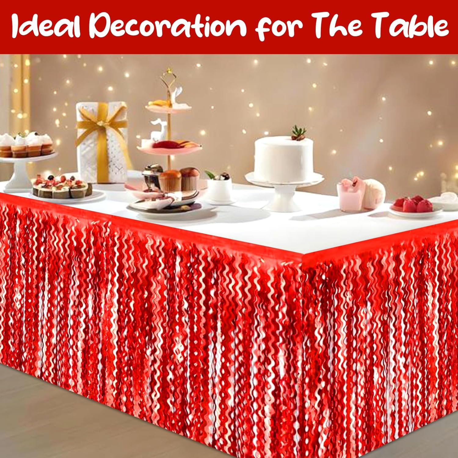 • Specifications and dimensions:6 Packs metallic foil tassel table skirt 29x108 inches, which is enough to decorate your party.