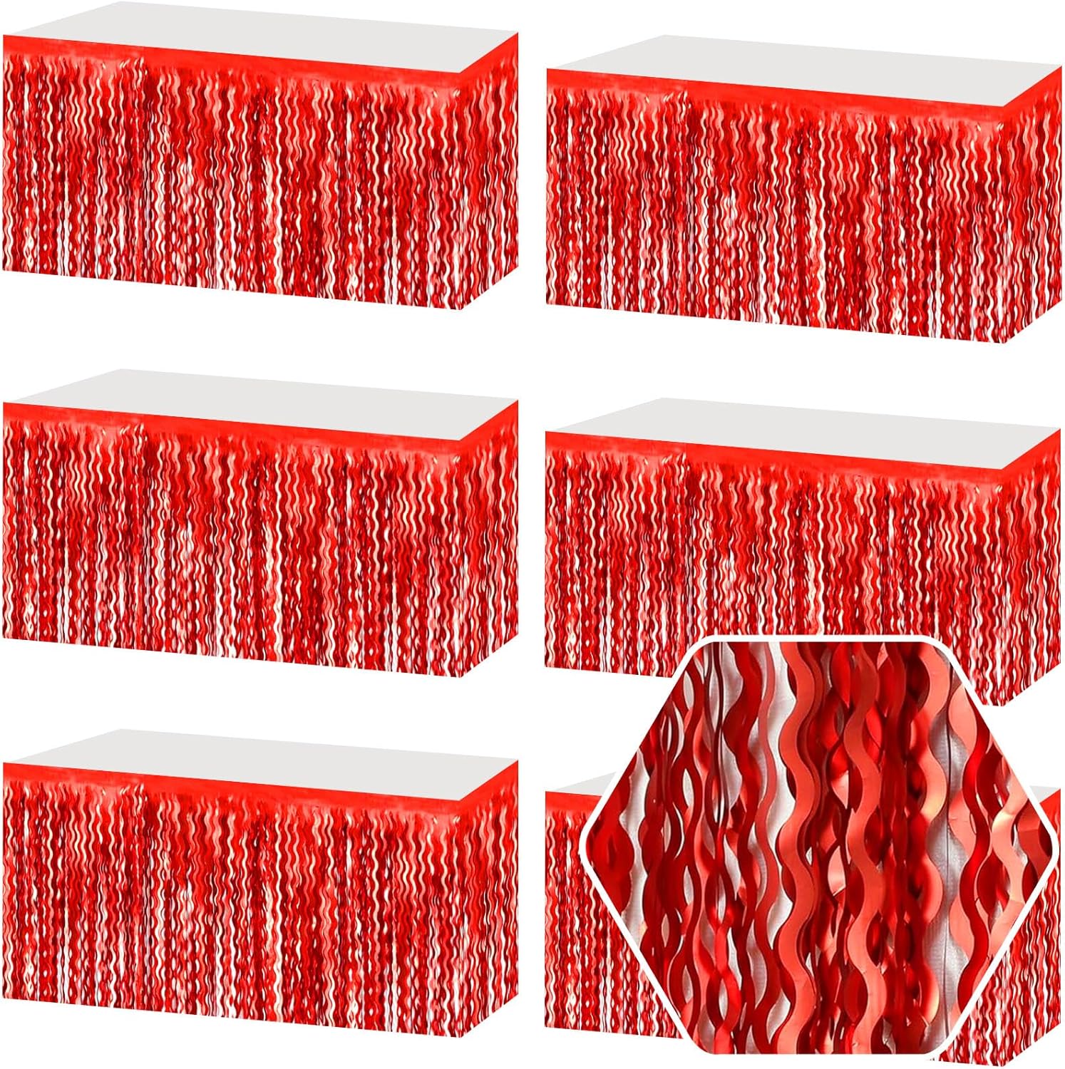 6 Pack 29 x108 Inch Red Wave Foil Fringe Table Skirts Metallic Banner for Tinsel Streamer Garland Backdrop for Parade Floats, Mother's Day, Easter, Wedding, Birthday Party Decoration
