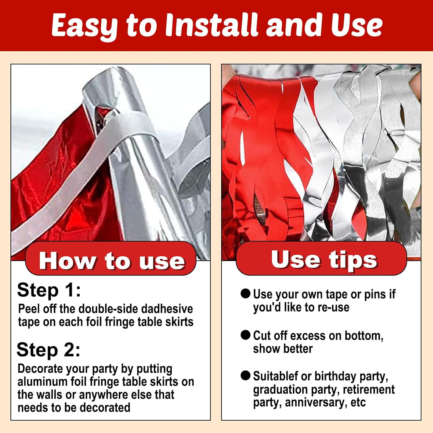 • Beautiful decoration: you can use these tinsel fringe table skirt to decorate a classroom, the stage for school program, a homecoming float, a wedding decoration, birthday party, Disco party, baby shower, halloween, christmas, new year's eve, bachelorette party, anniversary Memorial, Hollywood Party, independence Day, Carnival Party, Bridal Shower, Graduation and more.