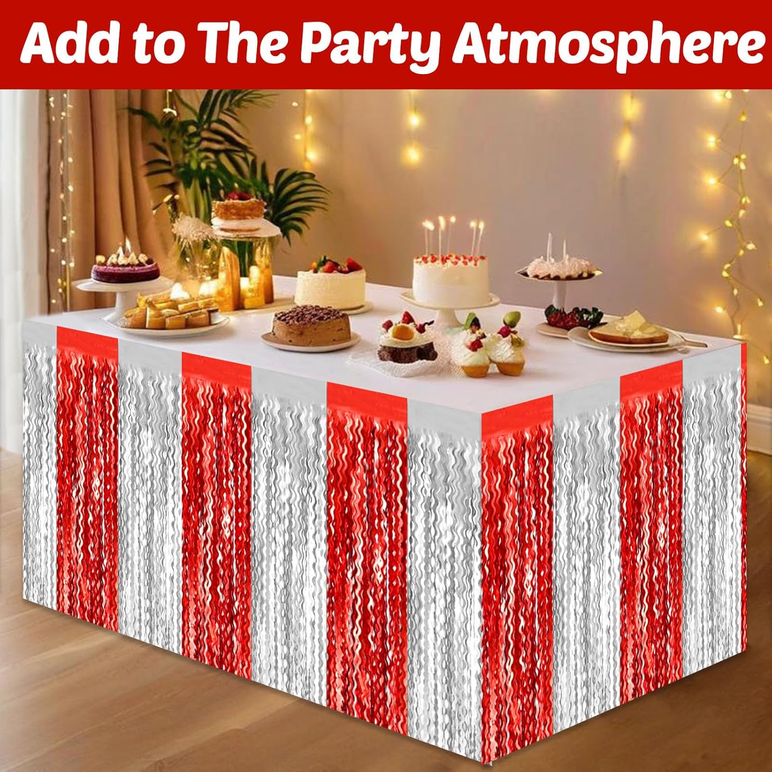 • Package Includes: 6pcs/set metallic fringe table skirts / shiny tassel banner, beautiful and shiny, provide you with great decoration effects, Each pack of table skirt measures 29x108 inches. Each one will be 9 Ft long, 6 pack will cover 54 FT length of tables.