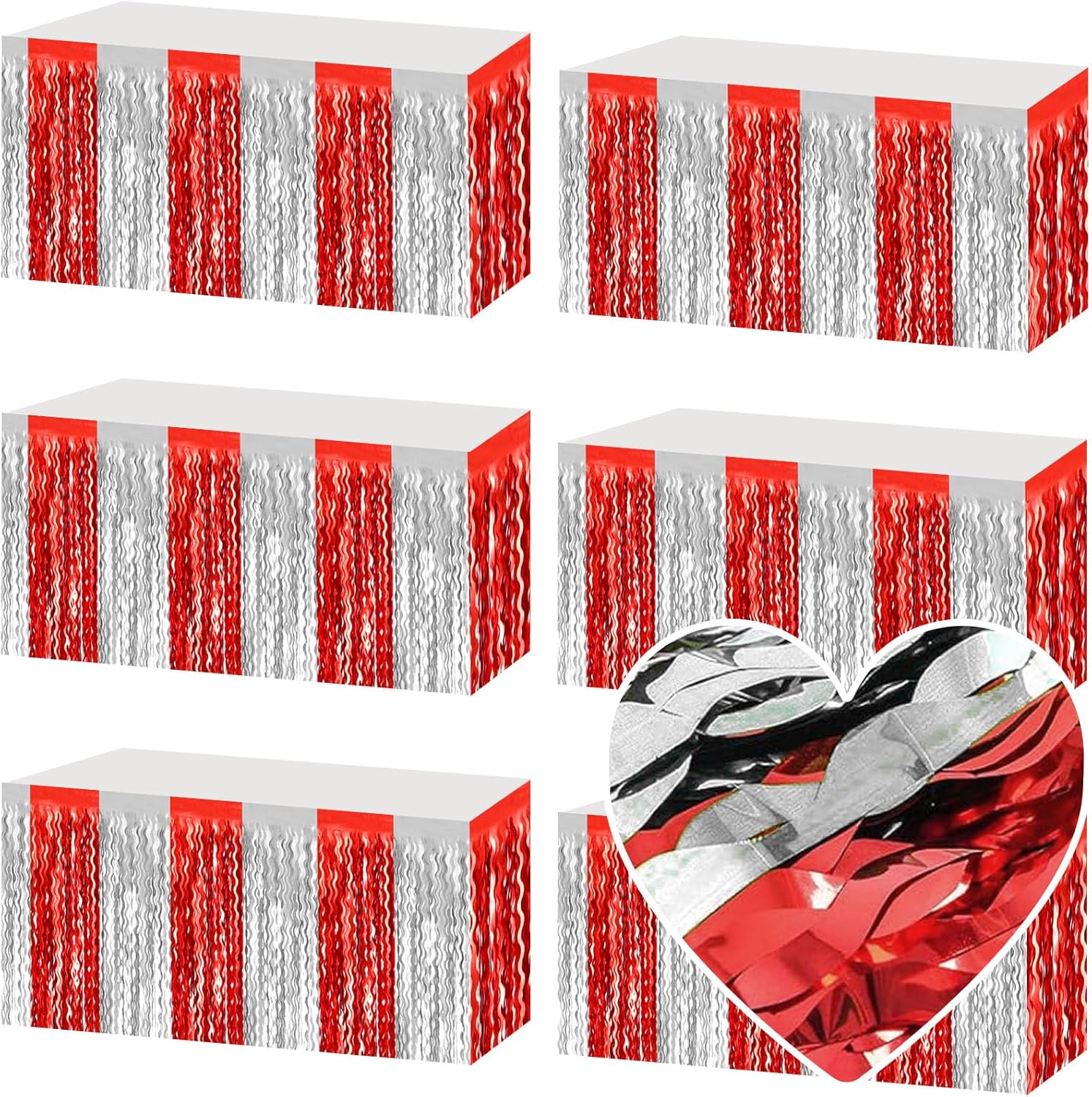 6 Pack 29x108 Inch Red Silver Wave Foil Fringe Table Skirts Metallic Banner for Tinsel Streamer Garland Backdrop for Parade Floats Wedding, Mother's Day, Birthday Mardi Gras Party Decorations
