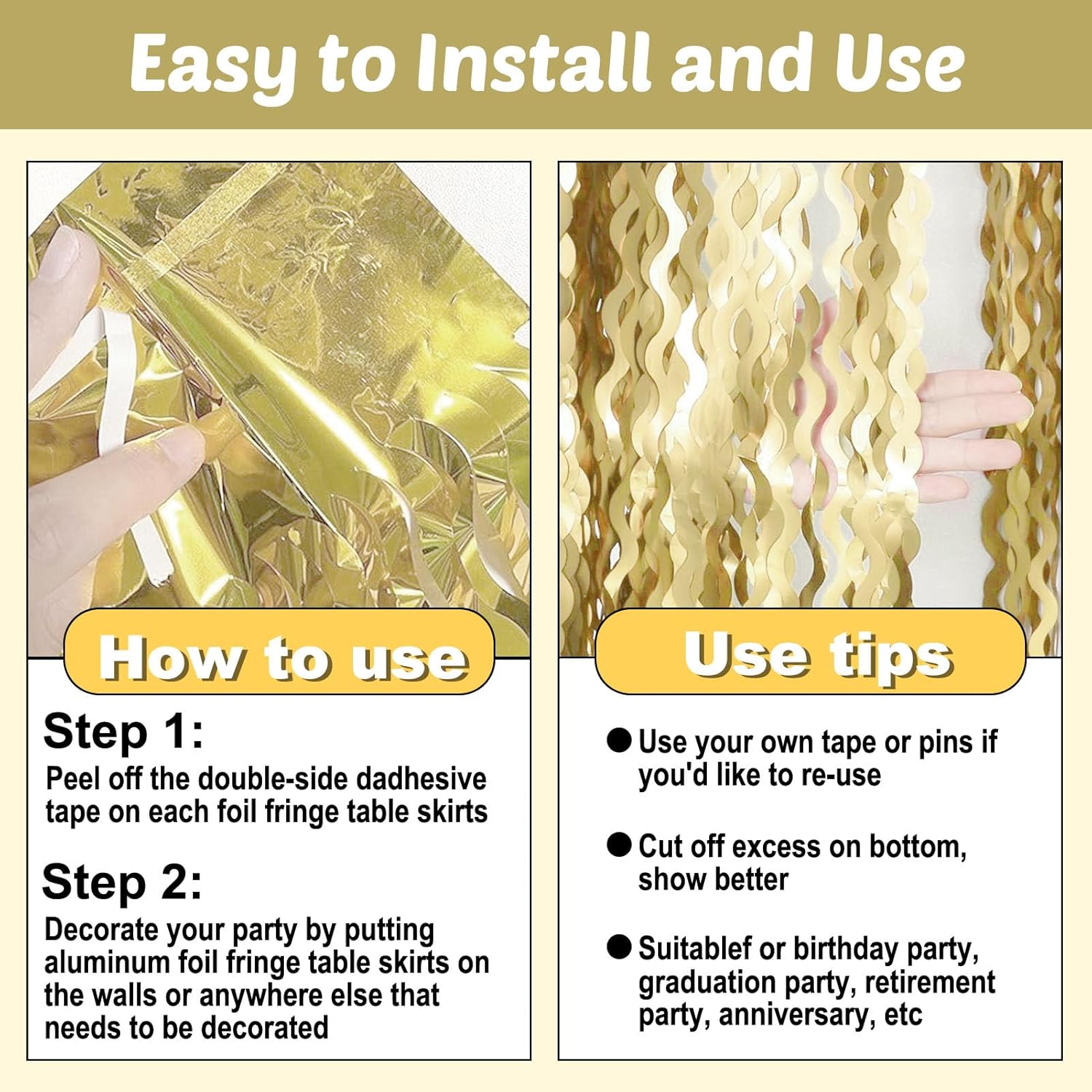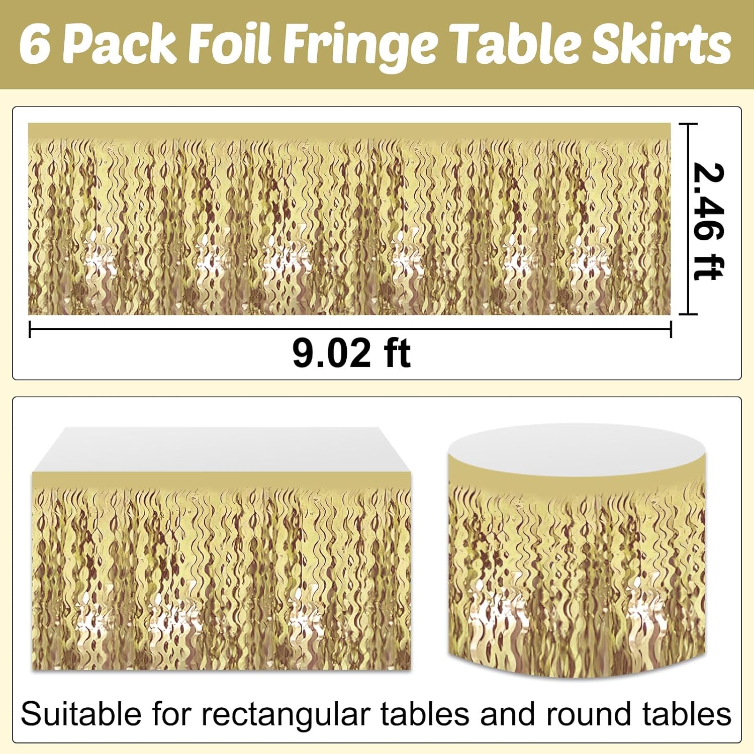 • Package Includes: 6pcs/set metallic fringe table skirts / shiny tassel banner, beautiful and shiny, provide you with great decoration effects, Each pack of table skirt measures 29x108 inches. Each one will be 9 Ft long, 6 pack will cover 54 FT length of tables.
