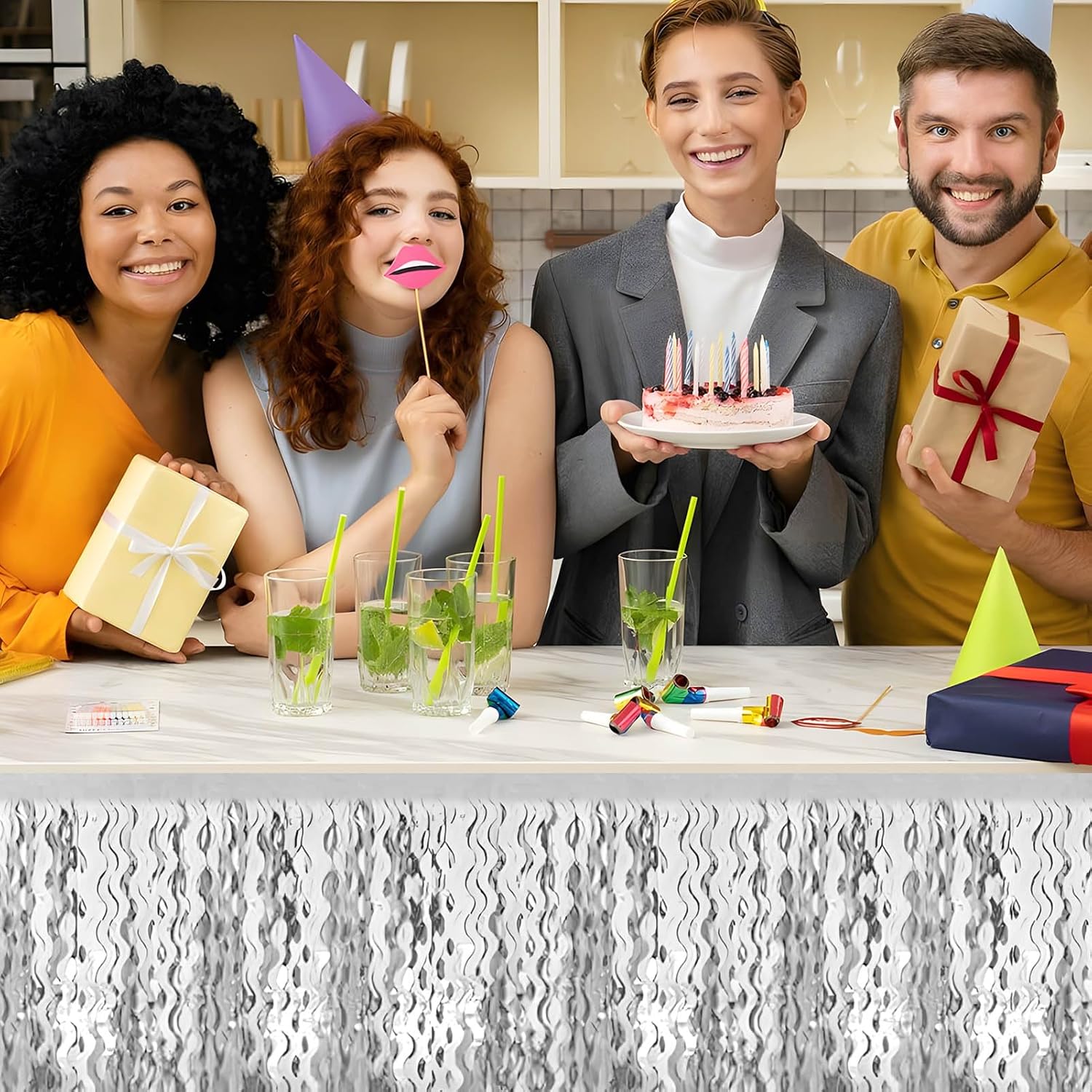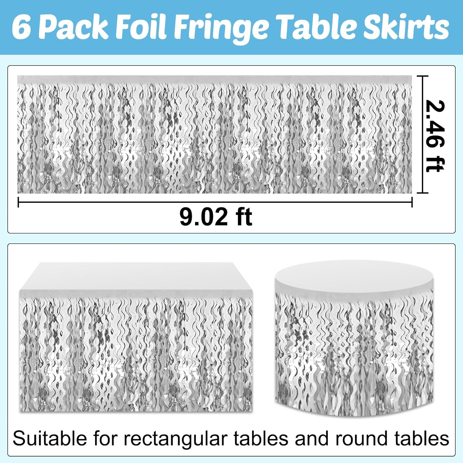 6 Pack 29x108 Inch Silver Wave Foil Fringe Table Skirts Metallic Banner for Tinsel Streamer Garland Backdrop for Parade Floats Wedding, Mother's Day, Birthday Mardi Gras Party Decorations