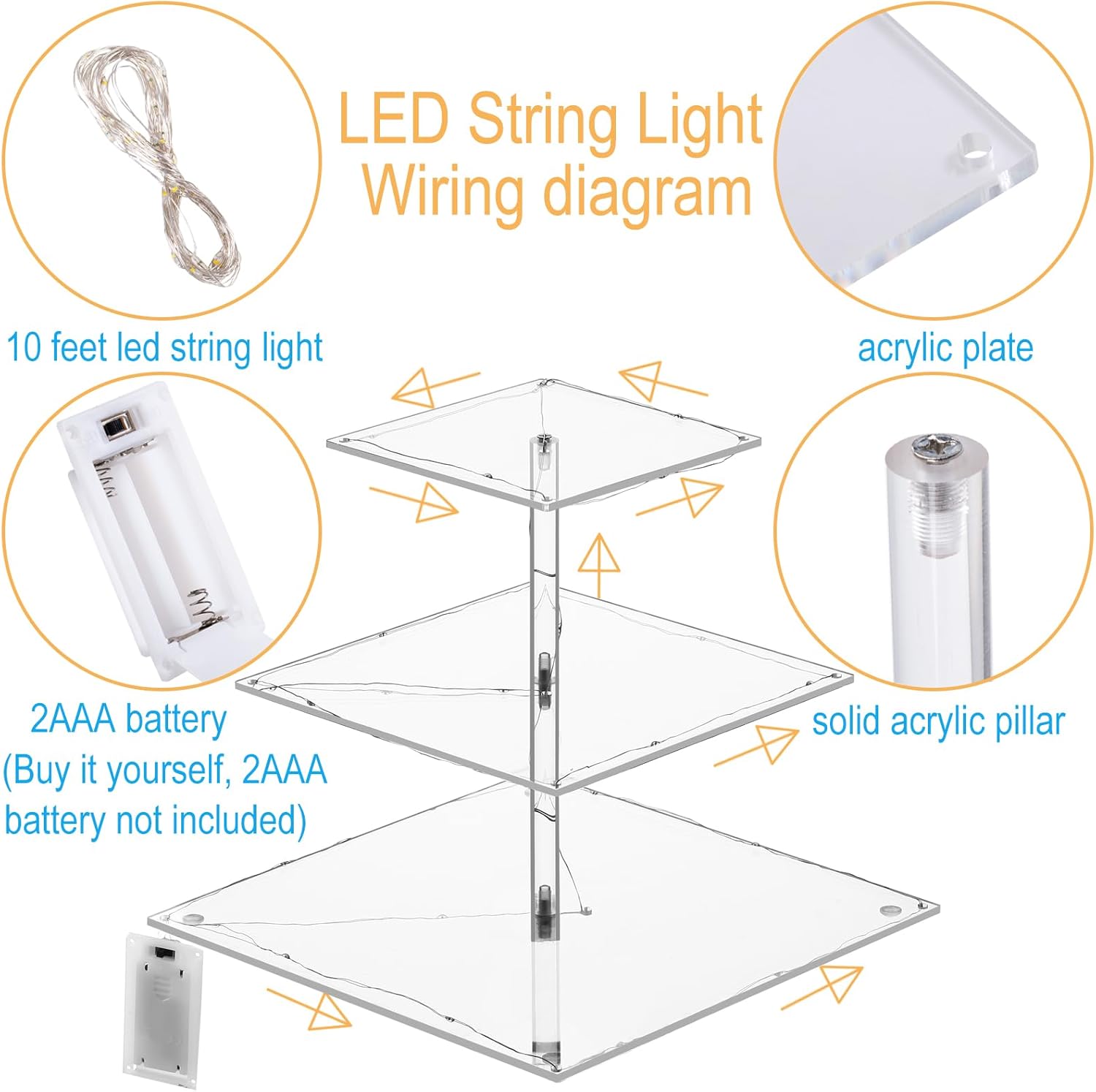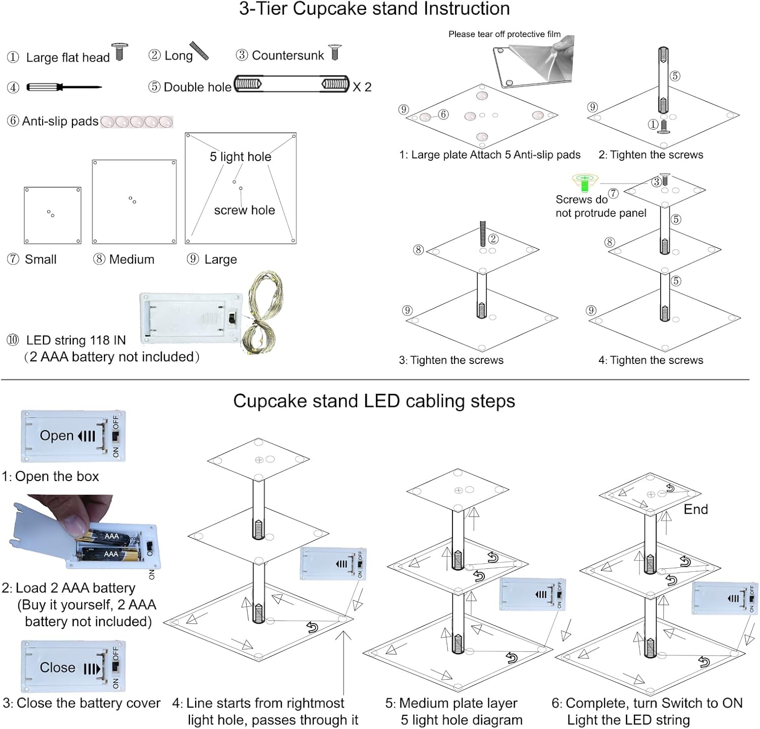 • What You Get: Cupcake tower include 1 X 3 tier cupcake stand, 1 X Phillips Screwdriver, 1 X 10 feet LED Light (2 AAA battery not included), 1 X Specification