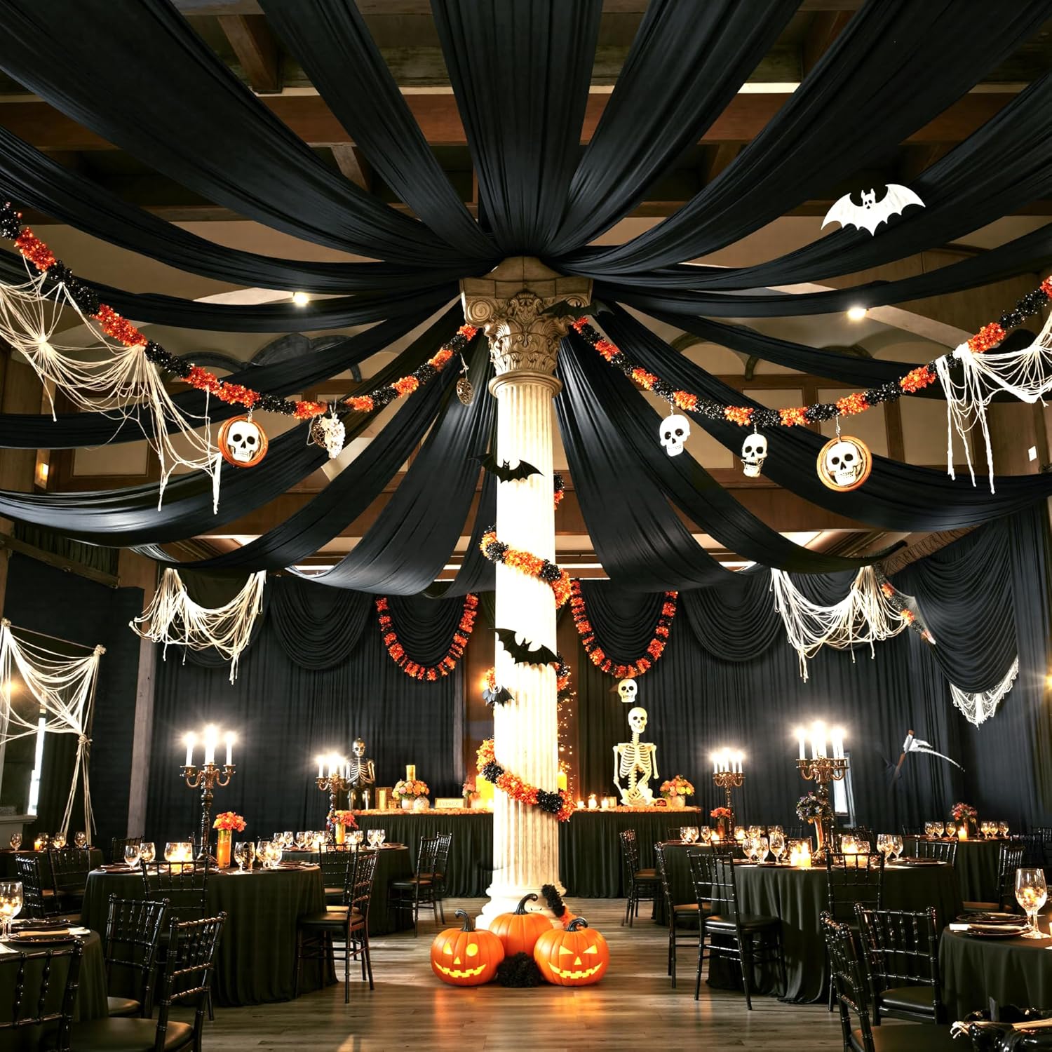 PartyVillage 12 Panels 5ftx30ft Black Ceiling Drapes for Halloween Parties – 30 FT Extra Long Thick Polyester Wrinkle-Free Drapery Tent Decor Decorations for Birthday Party Ceremony Stage Swag
