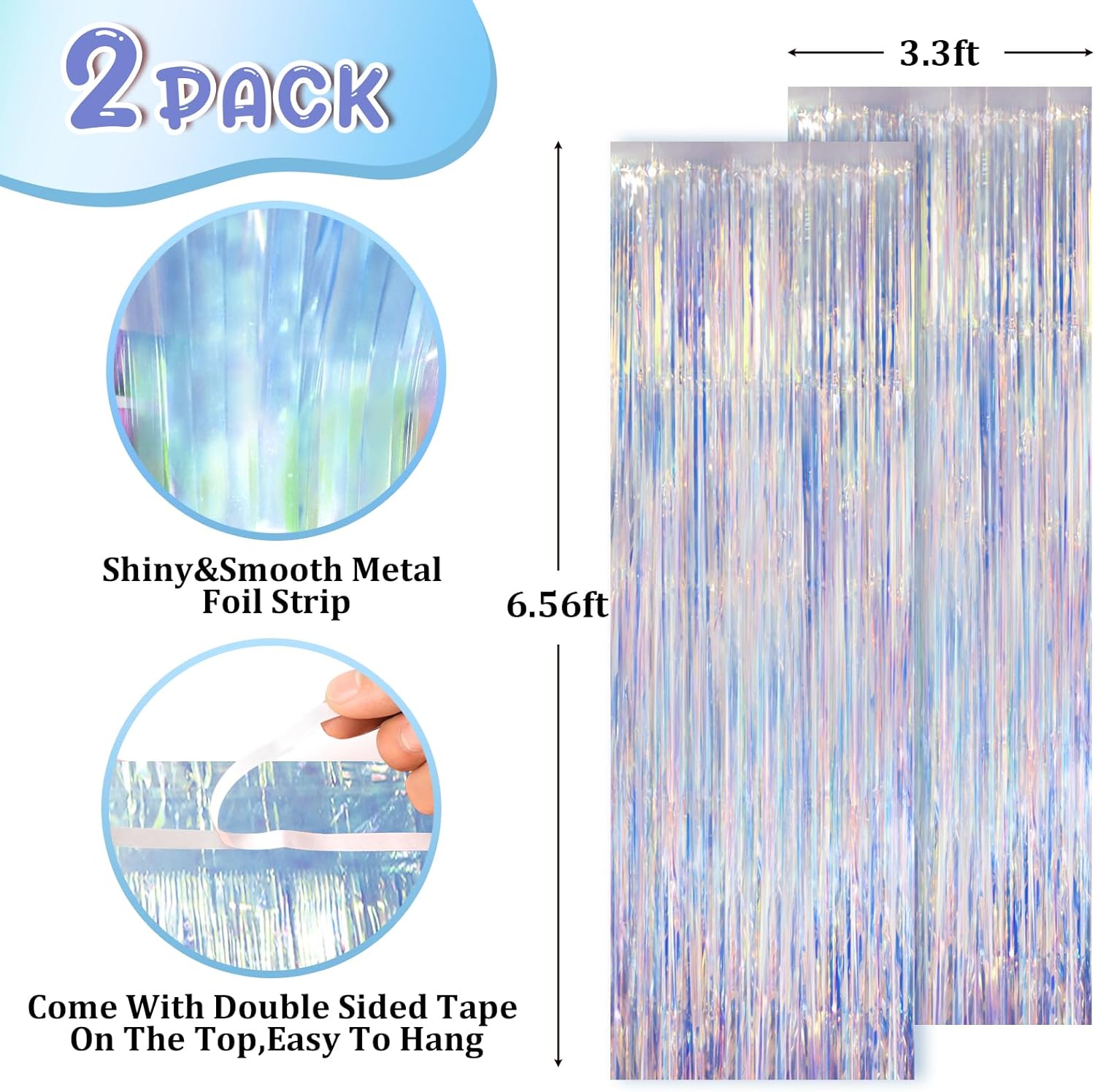 • Stunning Decorative Set: You'll receive 2 pcs iridescent foil fringe backdrop curtains, each measuring 3.28 ft (wide)×6.56 ft (drop). Enough length foil fringe curtains backdrops are perfect for the door or wall to create an impressive decoration