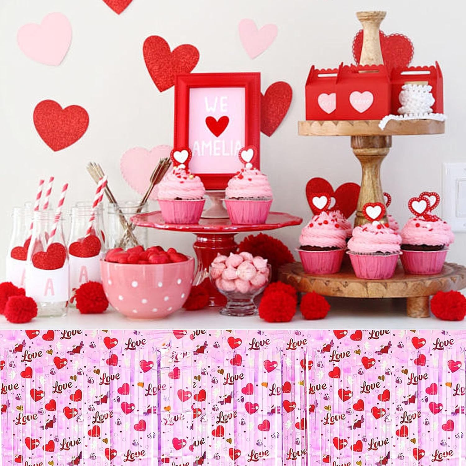 6 Pack 29 x108 Inch Love Pink Wave Foil Fringe Table Skirts Metallic Banner for Tinsel Streamer Garland Backdrop for Parade Floats, Mother's Day, Easter, Wedding, Birthday Party Decoration
