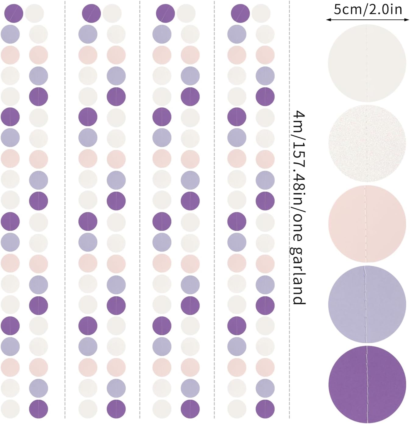 • PACKAGE CONTAINS: This set has four purple white pink paper circle garland,the length of each strand is 4 meters/13.1 feet, the total length is 16 meters/52.5 feet.The size is 2IN.