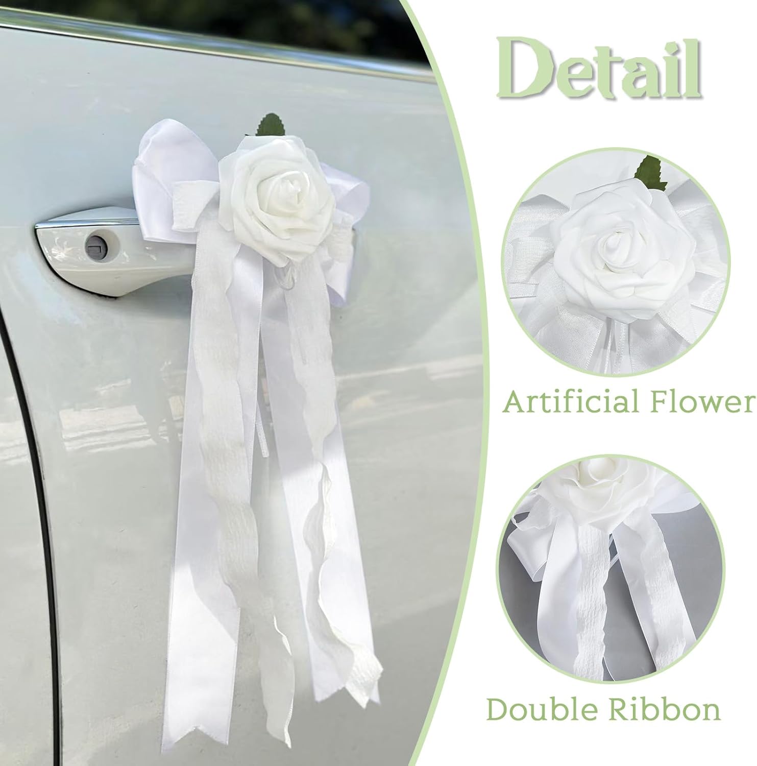 6PCS Wedding Car Door Handle Flowers, White Artificial Cars Rearview Mirror Bouquet Flower Bowknot Ribbon Decors, Just Married Automotive Decoration Accessories for Door Handles and Rearview Mirrors