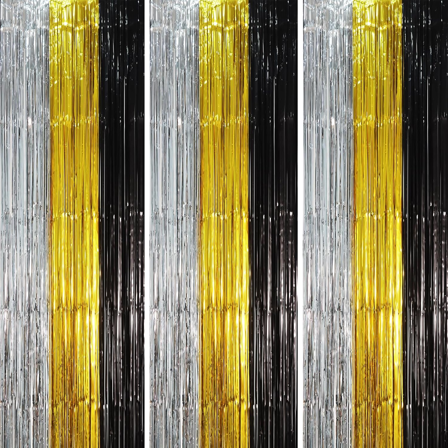 3 Pack 3.3 x 8.2 ft Black Gold Silver Foil Fringe Backdrop Curtains, Tinsel Streamers Party Decorations, Fringe Backdrop, Door Shimmer for New Years or Birthday Party