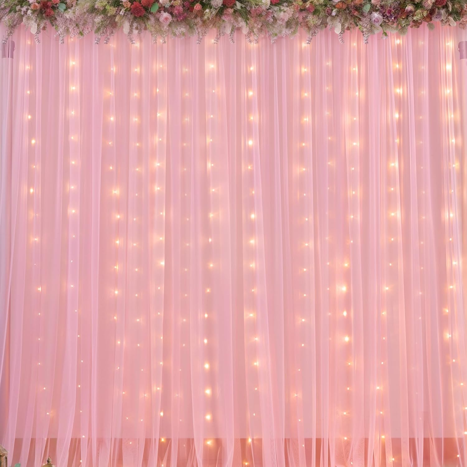 • Pink Sheer Backdrop Curtain with Lights Occasions: Perfect for weddings, baby showers, bridal showers, birthday parties, anniversaries, New Year celebrations, family gatherings, and other occasions to create a memorable photo backdrop. The tulle backdrop curtains can be reused many times. For a fuller effect, consider purchasing multiple sets to use together