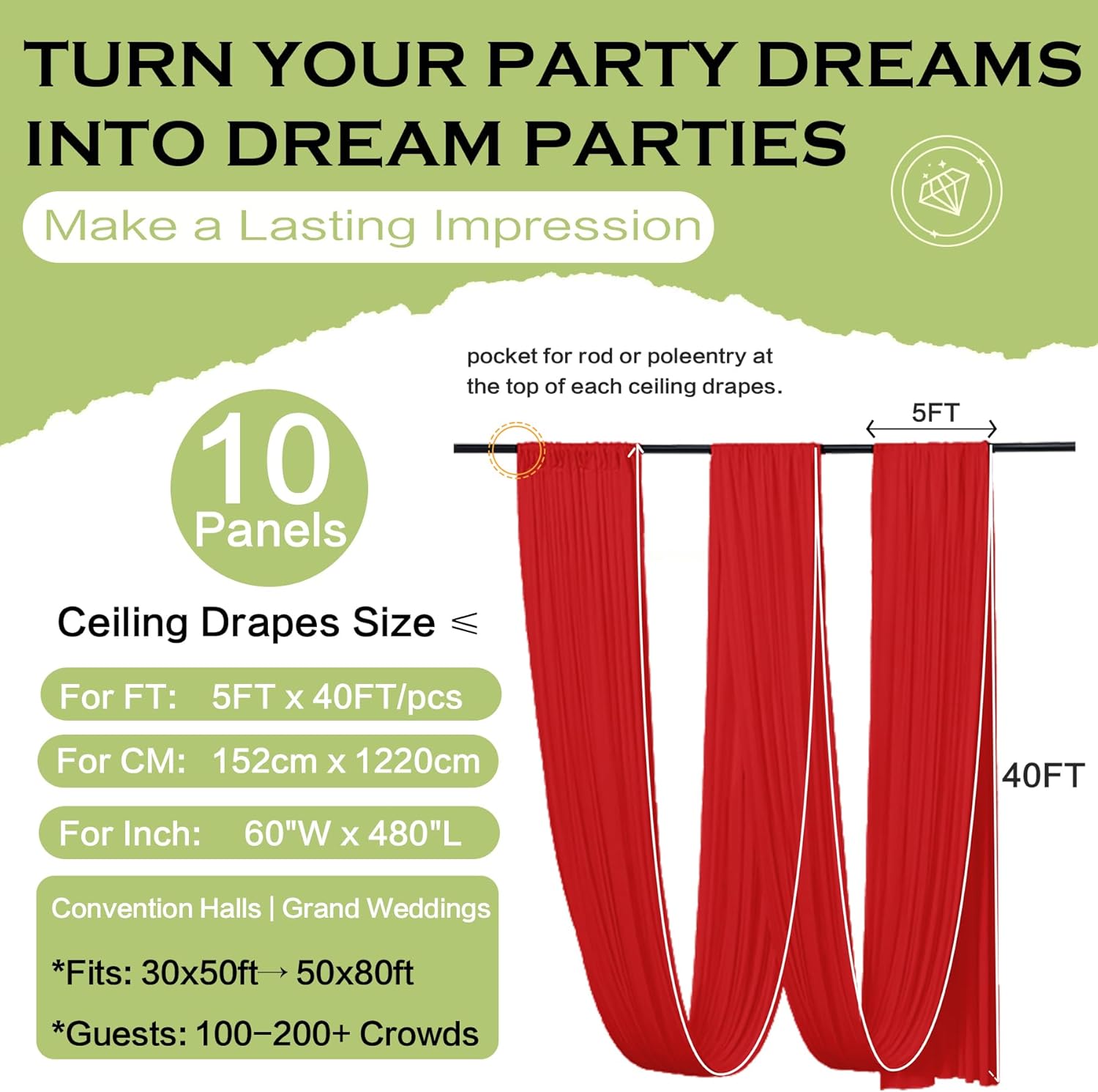 • 40ft Extra Long Ceiling Drapes: 10 Panels 5ftx40ft Red Backdrop Curtains for Parties. Totally 50FT(Width) x 40FT(Height). cortinas para fiestas decoracion.