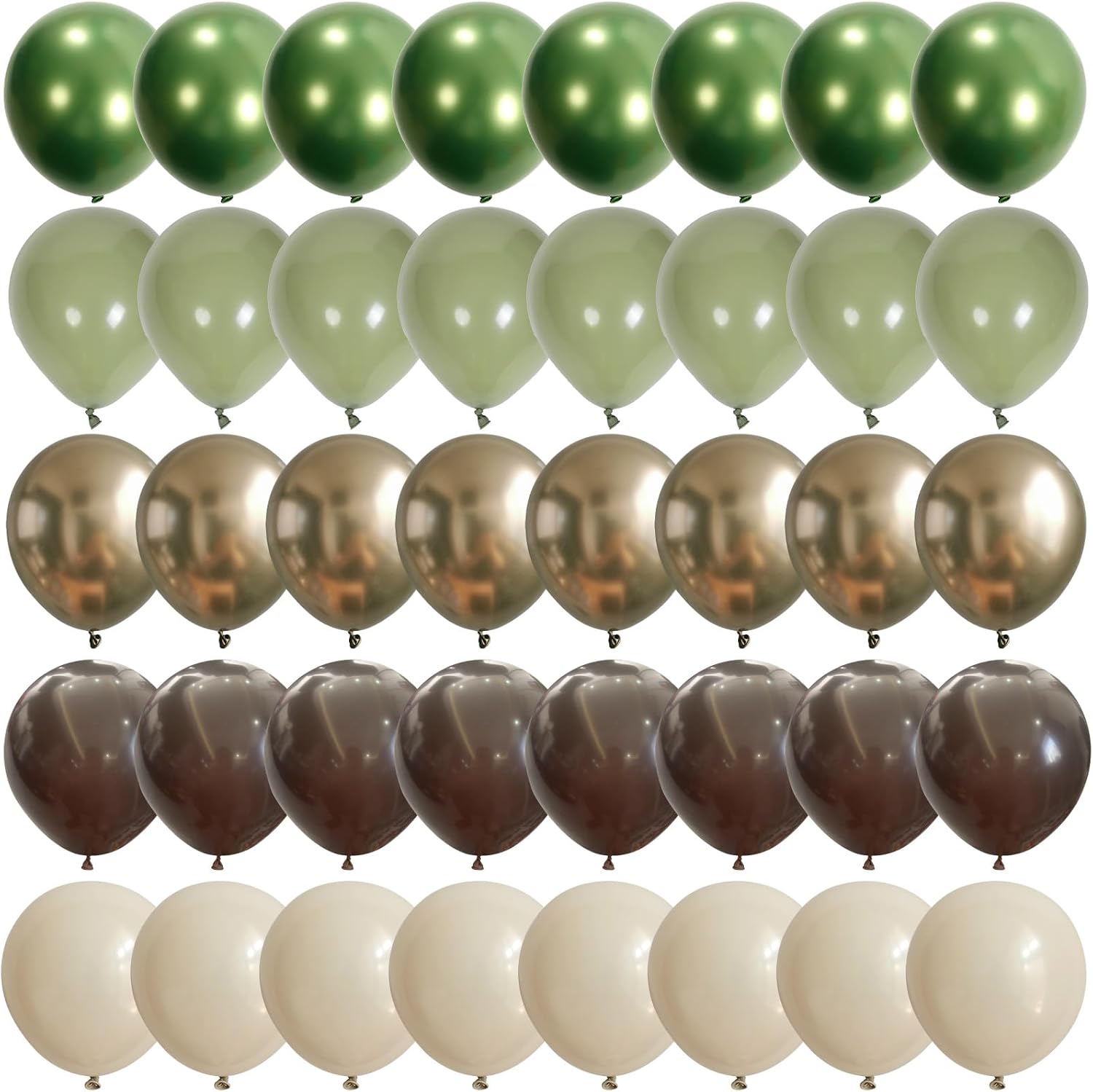• Party Balloons Set: The camping balloons set have 60pcs 12inch helium balloons, include 20pcs sage green balloons, 13pcs cocoa dark brown balloons, 12pcs beige cream balloons, 7pcs chrome gold balloons, 8pcs chrome sage green balloons, 2pcs balloon ribbon (white, bright green).