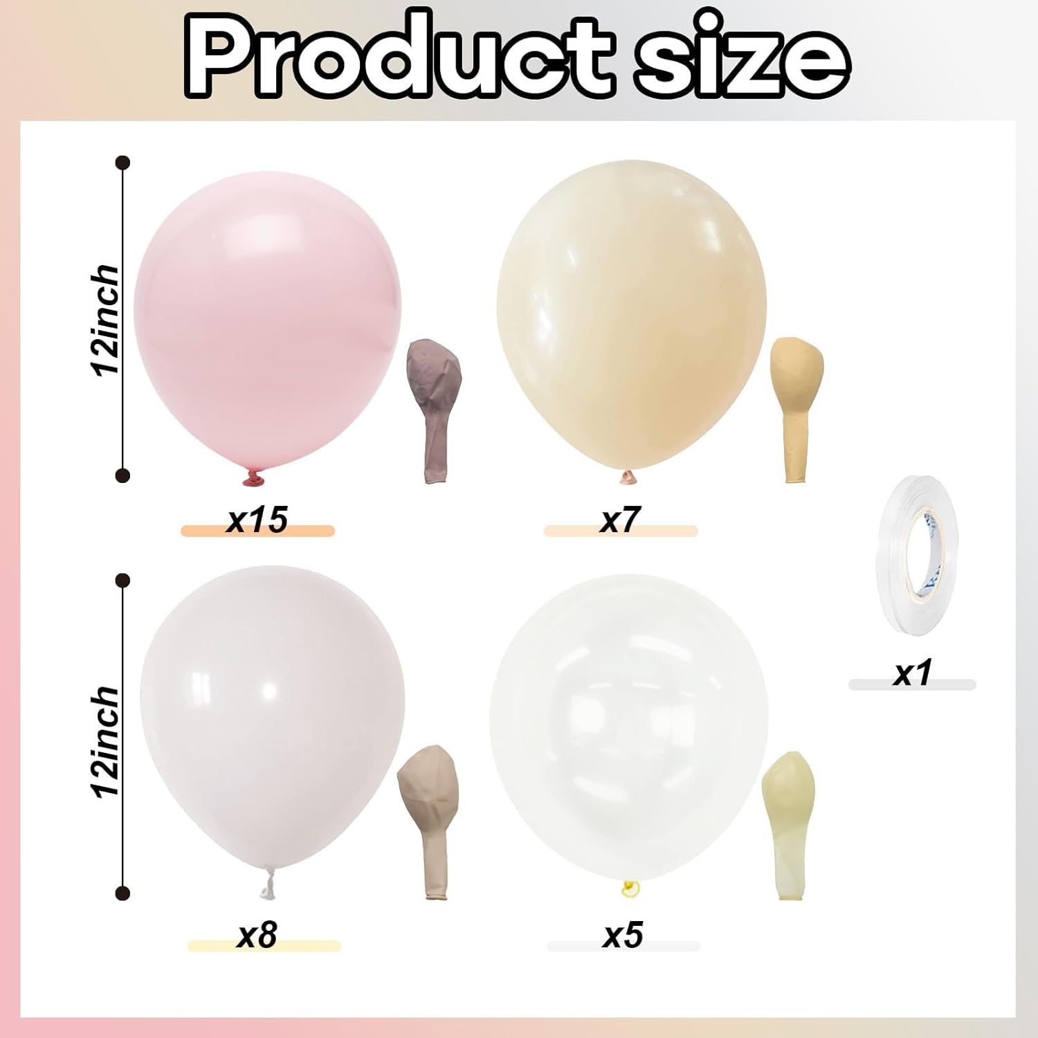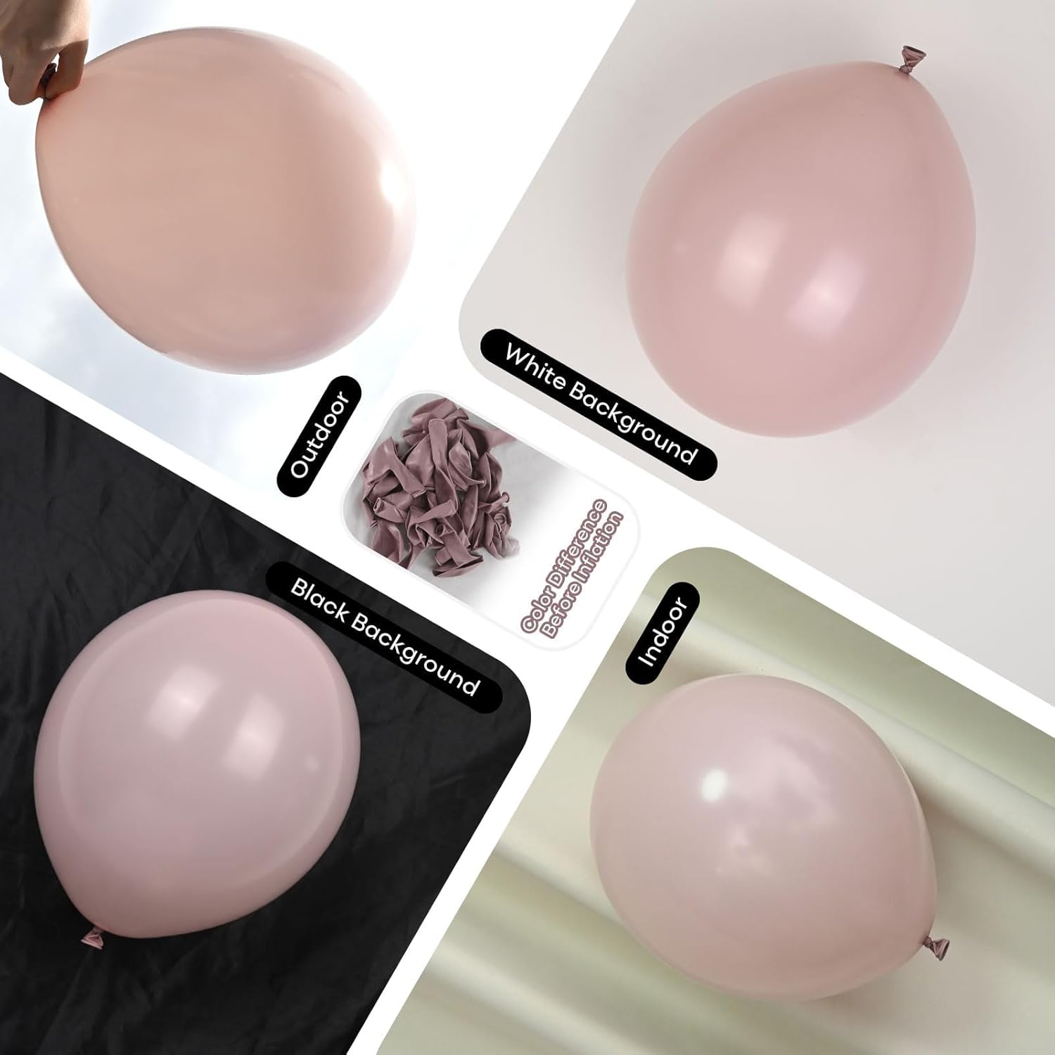 • Please Note: THE COLOR OF BALLOONS BEFORE INFLATION MAY APPEAR DARKER OR DIFFERENT FROM THE IMAGES SHOWN, ESPECIALLY FOR DUSTY PINK AND SAND WHITE BALLOONS. ONCE INFLATED, THE COLORS WILL BECOME LIGHTER AND MORE CLOSELY RESEMBLE THE PRODUCT PHOTOS. For best results, we recommend inflating white and pink balloons to about 90% capacity.