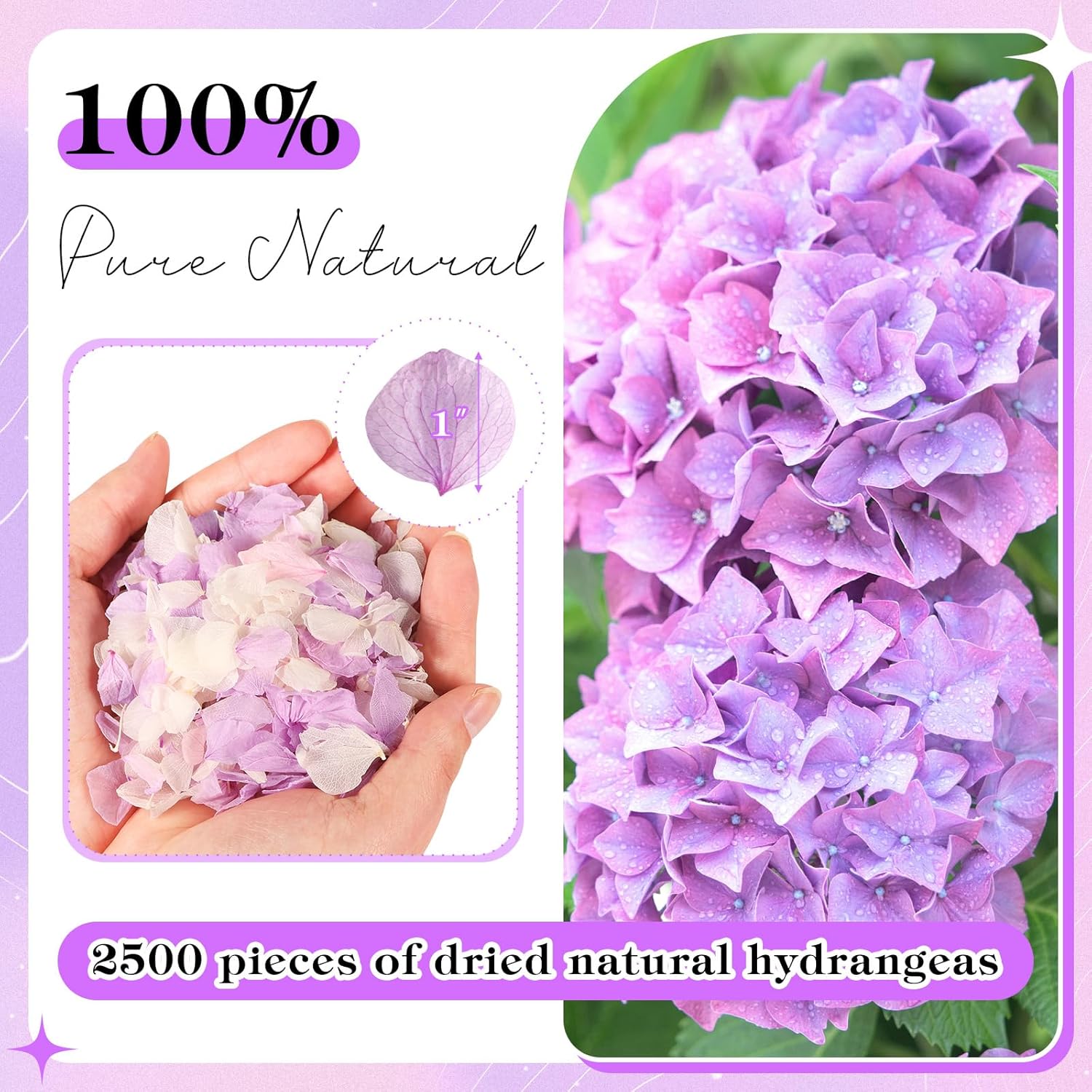 • Natural Hydrangea Petals: Our purple and white hydrangea petals are made of 100% natural real flowers, selected high-quality purple and white hydrangea petals, each petal is carefully processed to maintain its natural shape and color.