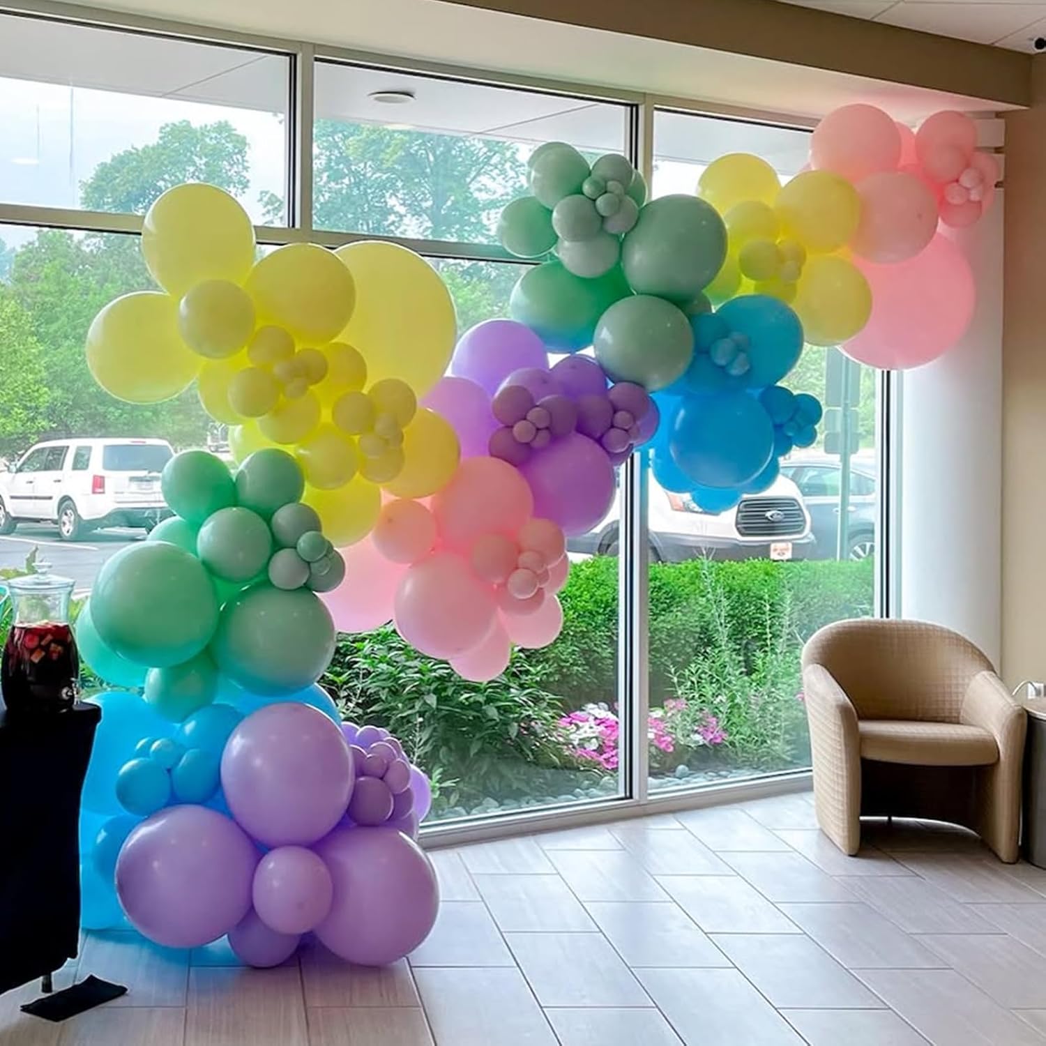 • 【Pastel Balloon Garland Arch Kit】 Each sets contains 132pcs pastel party balloons with different size of 6 colors (yellow, blue, green, pink, purple, teal) and a roll of 16ft garland strip and glue dots. The right amount quantity and most suitable color for each party decoration.