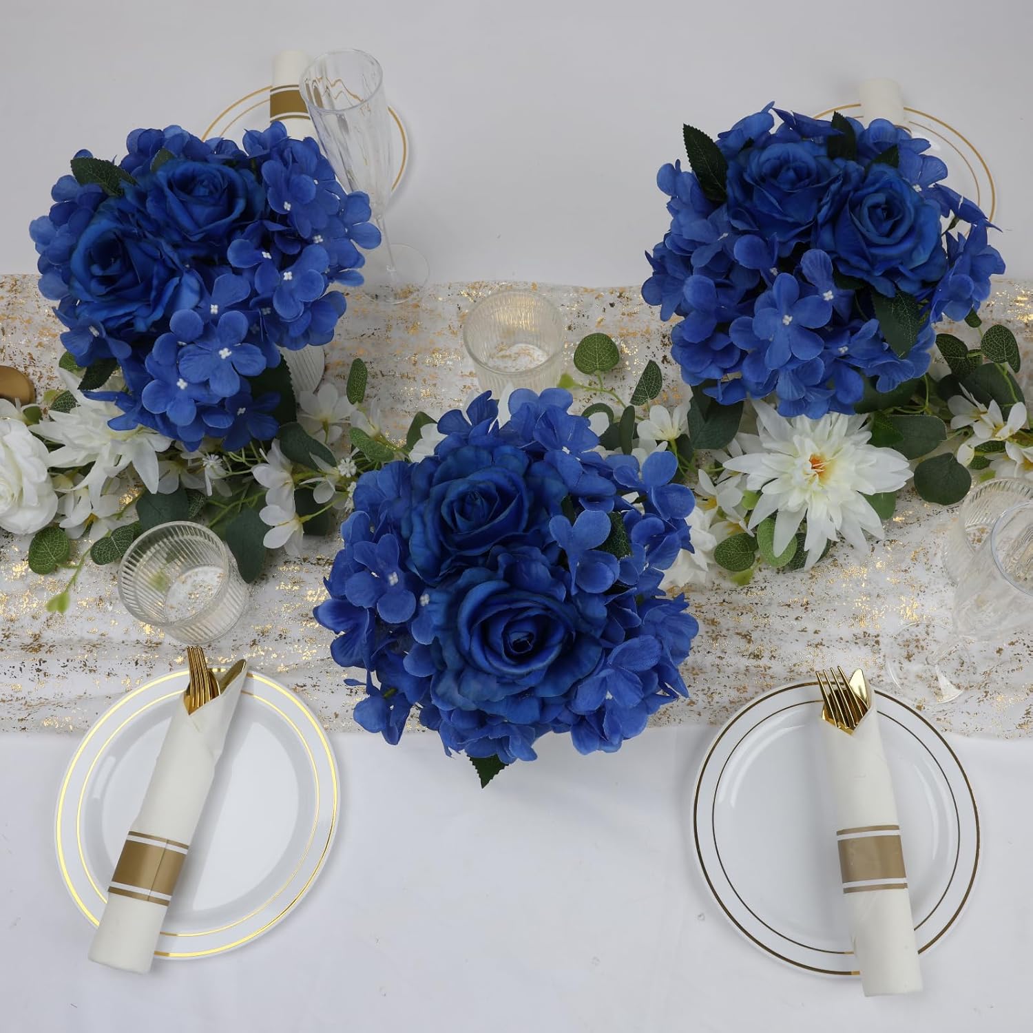 Flower Table Centerpieces - Set of 6 Floral Arrangement Artificial Wedding Hydrangeas Floral Arrangement with Rustic Metal Vase for Bridal Tea Party Event Decorations - Royal Blue
