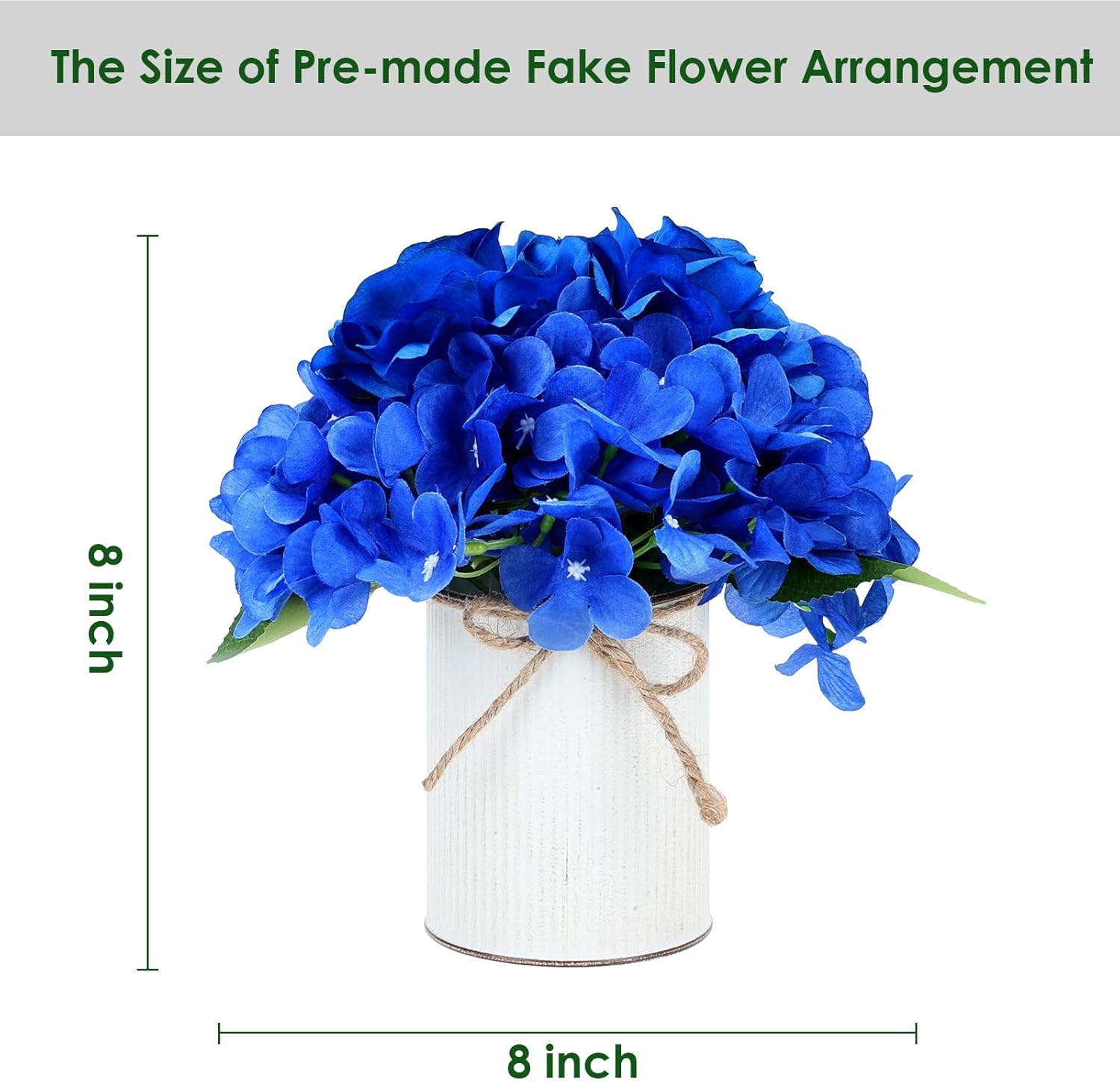 • Pack of 6 pre-made artificial flowers with rustic metal pot for table centerpieces. Consists of high quality royal blue fake roses and faux hydrangeas.