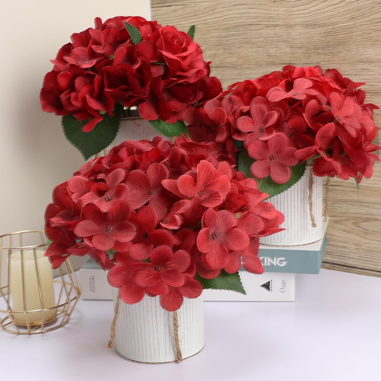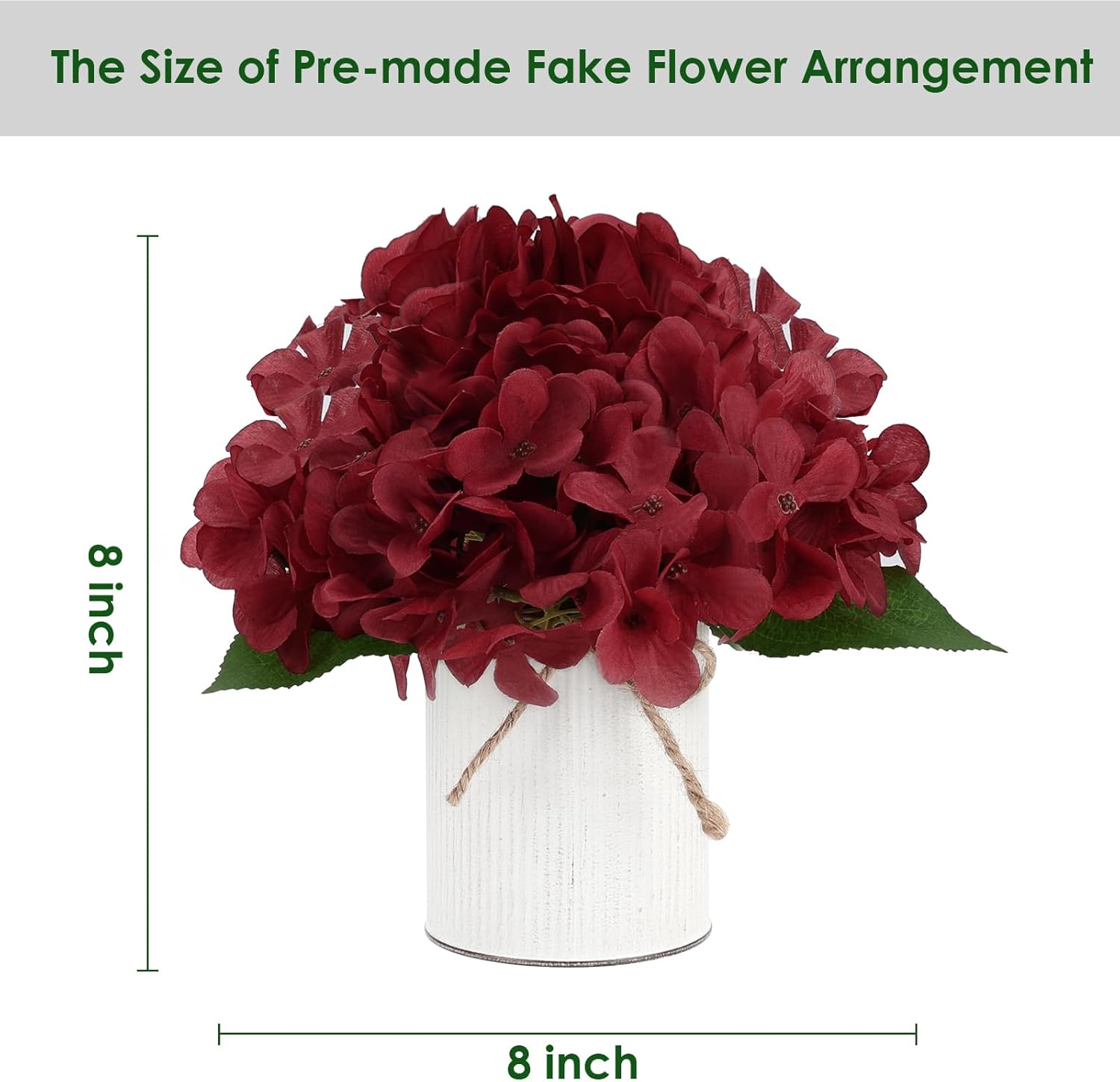 Flower Table Centerpieces - Set of 6 Floral Arrangement Artificial Wedding Hydrangeas Floral Arrangement with Rustic Metal Vase for Bridal Tea Party Event Decorations - Deep Red