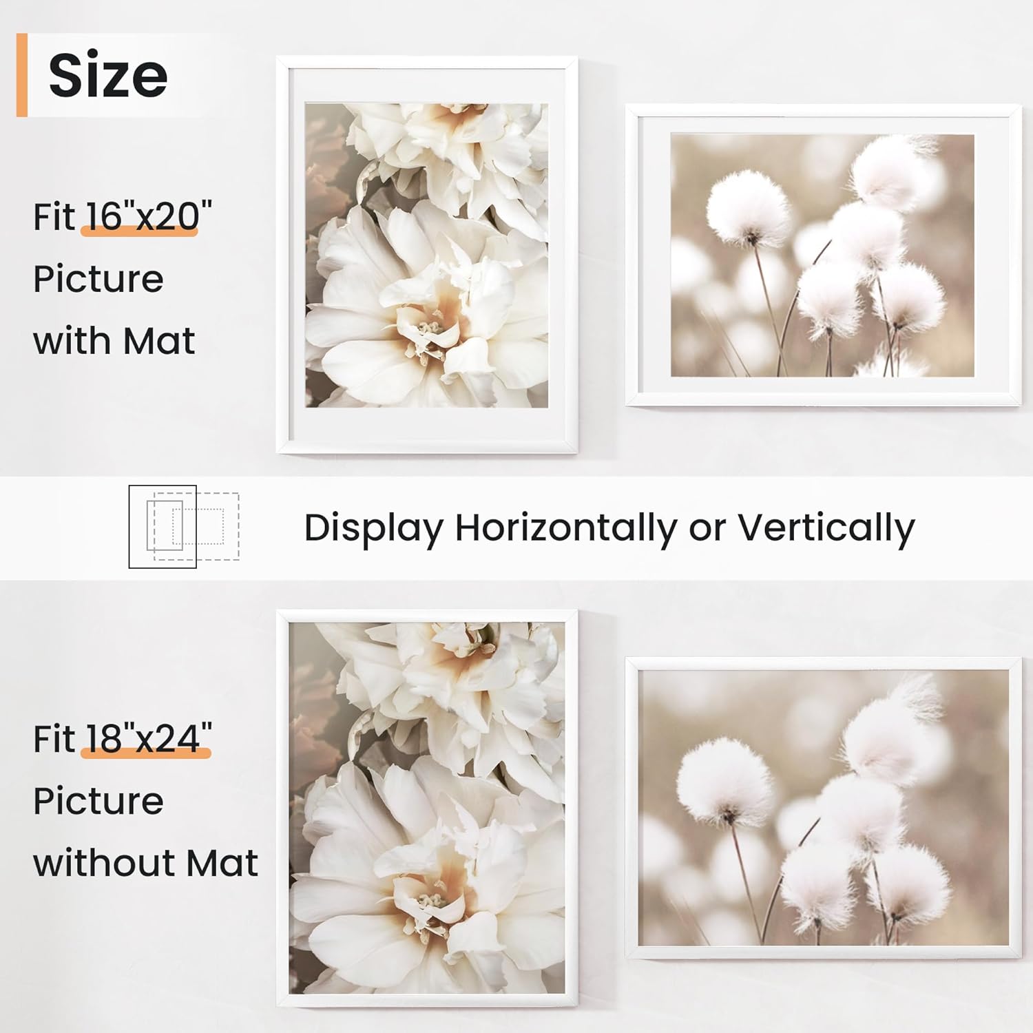 • Display Precious Memories - Showcase your cherished moments with our 18x24 plastic frame. It's lightweight yet sturdy with a superior quality finish. The white mat opening (measuring 15.5x19.5) is perfect for a 16x20 picture with the mat, or an 18x24 picture without it.