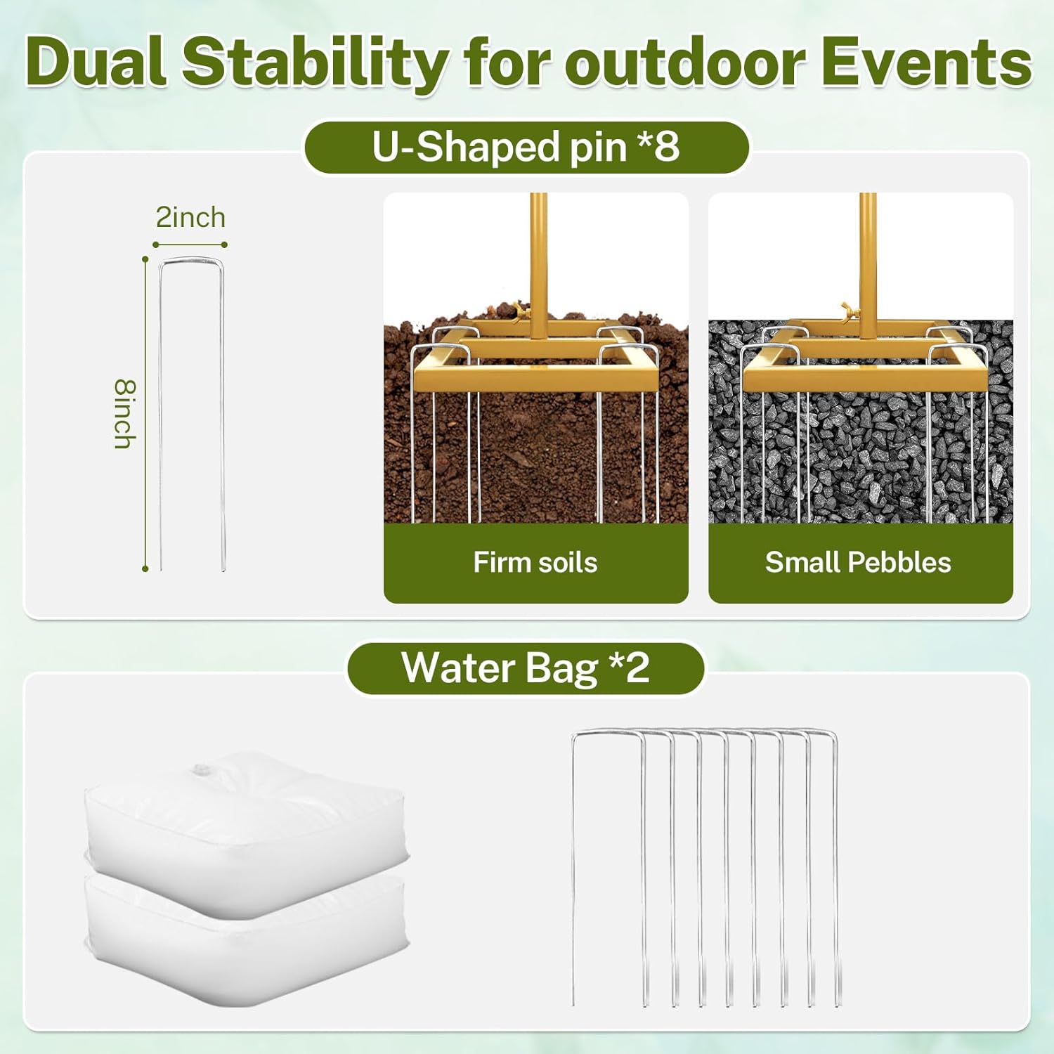 • 【Enhanced Stability Features】 For added security, our back drop stand comes with 8 ground stakes to anchor it on outdoor surfaces like grass or gravel. Additionally, two extra water bags are included to increase wind resistance during outdoor events, ensuring the stand remains firmly in place indoors or outdoors.