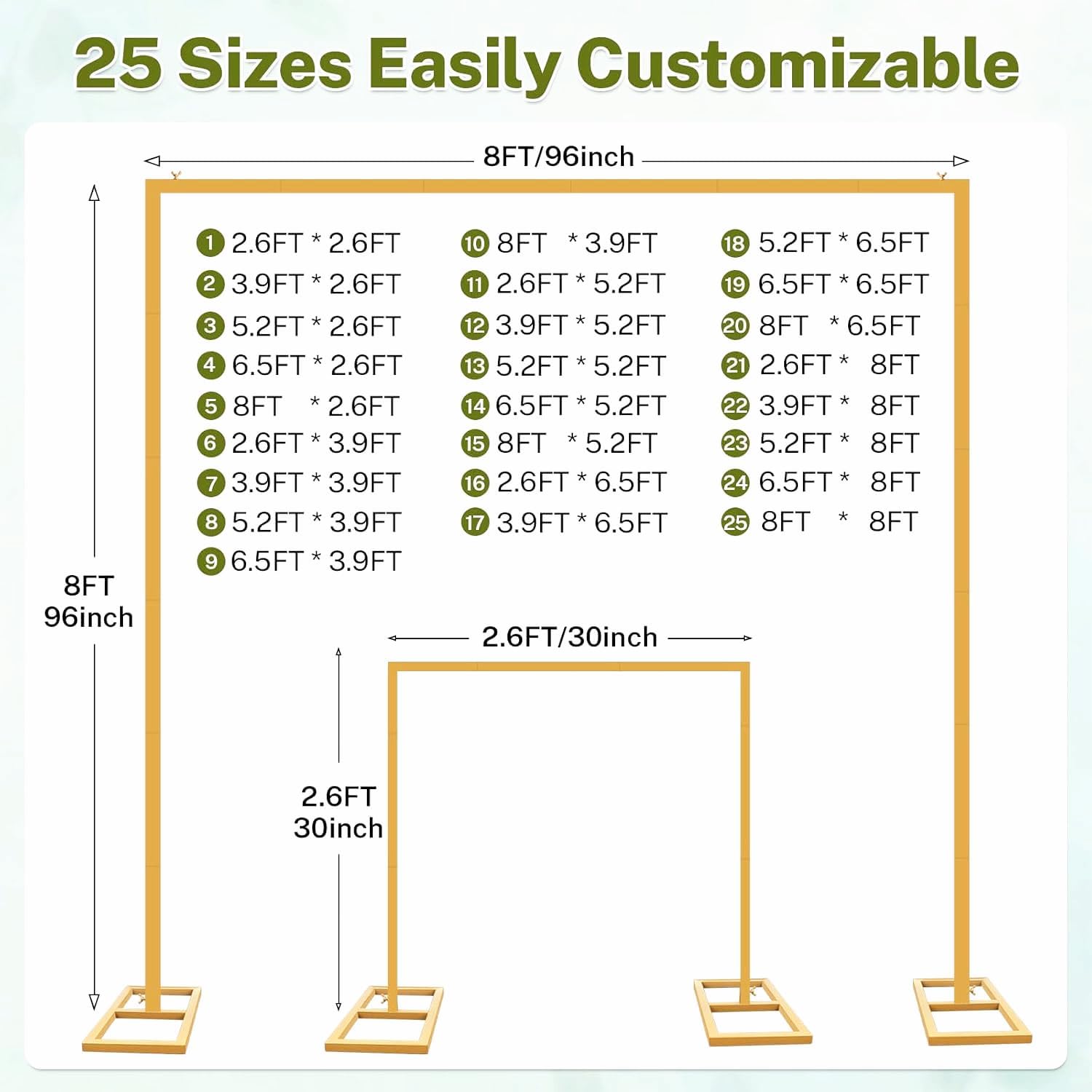• [Heavey Duty Backdrop Stand] Our 8FT heavy-duty square backdrop stand features a gold rust-resistant finish and a sturdy, premium iron base for superior stability. Unlike other arch backdrop stand that use screws, which can loosen over time, our pipe joints connect via a rotating mechanism for a more secure and long-lasting hold. It also comes with a waterproof storage bag, making it easy to store and transport.