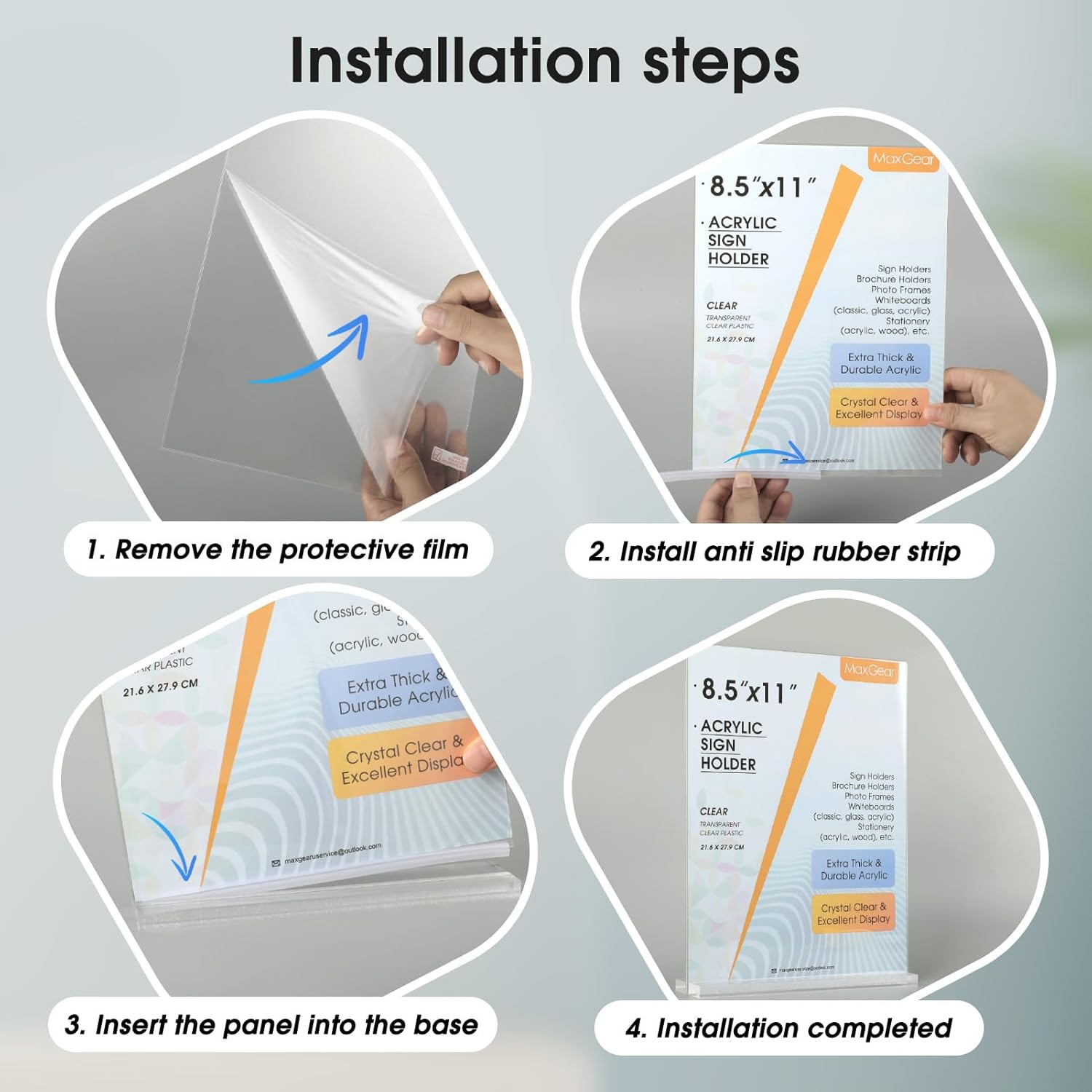• Premium Acrylic Sign Holders:Warm Tips: Please remember to remove the protective film from the acrylic panel and base before use. This step is crucial for achieving a clearer and more transparent display stand. Our high-quality acrylic material not only enhances the visual appeal of your displayed items but also ensures durability and longevity. Enjoy the full effect of your display with crystal-clear clarity