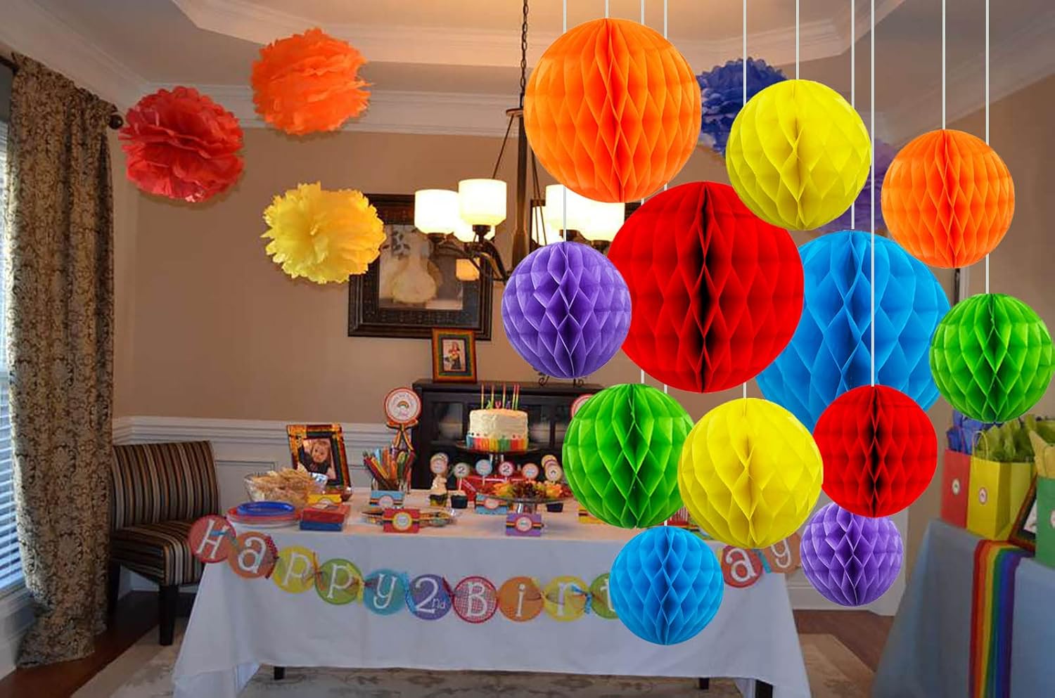 • HONEYCOMB DECORATIONS Package includes: 1 pc 10" red,1 pc 10" orange,1 pc 10" yellow,1 pc 10" green,1 pc 10" blue and 1 pc 10" purple,1 pc 6" red,1 pc 6" orange,1 pc 6" yellow,1 pc 6" green,1 pc 6" blue and 1 pc 6" purple honeycomb ball decorations.