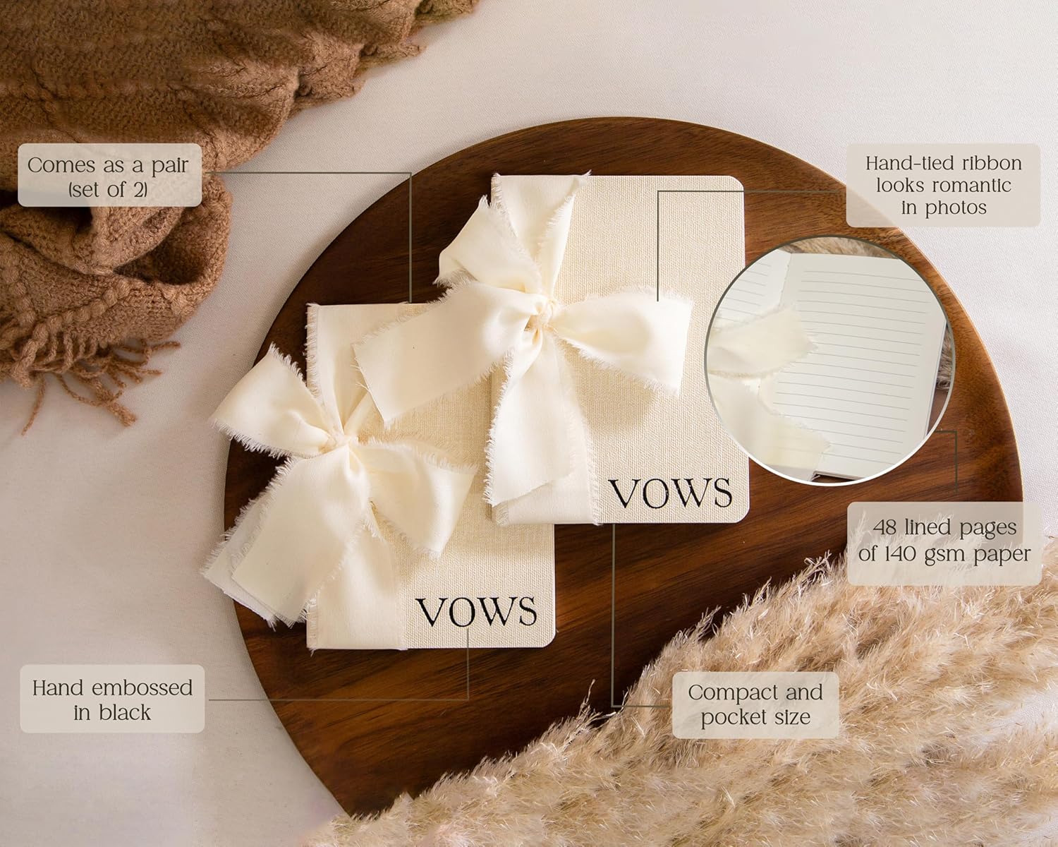 • Each vow book in our set measures 5.625 x 4 x .5 inches, making them pocket-sized for easy carrying. Crafted from high-quality materials, these softcover vow books offer durability with a sophisticated finish. The flowy ivory ribbon adds a touch of romance and softness against the texture of the book.