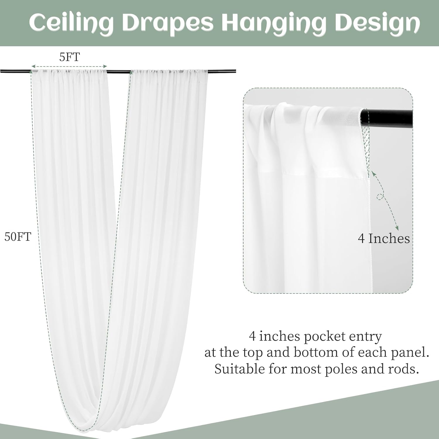 • 🥂Chiffon Ceiling Drapes: The package include 6 panels white wedding ceiling drapes (without hanging pieces). Each wedding extra long curtain measure for 5 feet width x 50 feet length. The sufficient quantity can meet your demands for decorating your weddings, parties, receptions. It will help to create a delicate and aesthetic sense to your wedding ceiling decoration.
