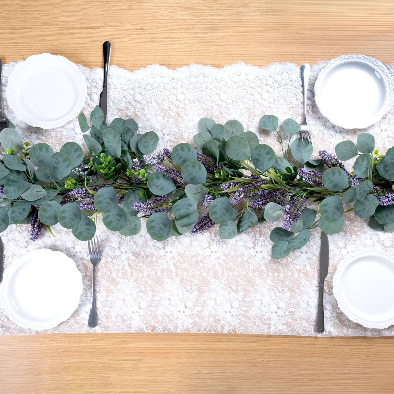 • 【eucalyptus garland with flower for table】6ft long handmade artificial silk silver dollar eucalyptus garland has rich leaves and a variety of light green eucalyptus and Purple Flower matte leaves and provides lifelike texture and tons of volume. Each eucalyptus garland is printed with veins to make it vivid.