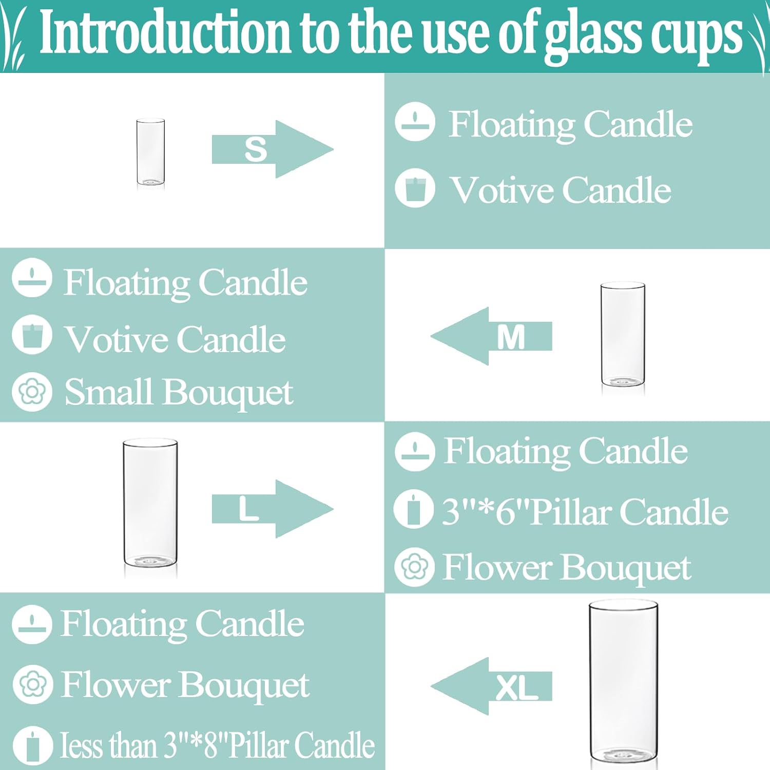 • Versatile Decoration : place floating candles on the water and light up to get a delicate and beautiful desktop center decoration.the clear cylinder vases bulk also can act as flower vases, pillar candle holders, floating candle holders, table centerpieces, storage containers for green plants, succulents, stones and so on.