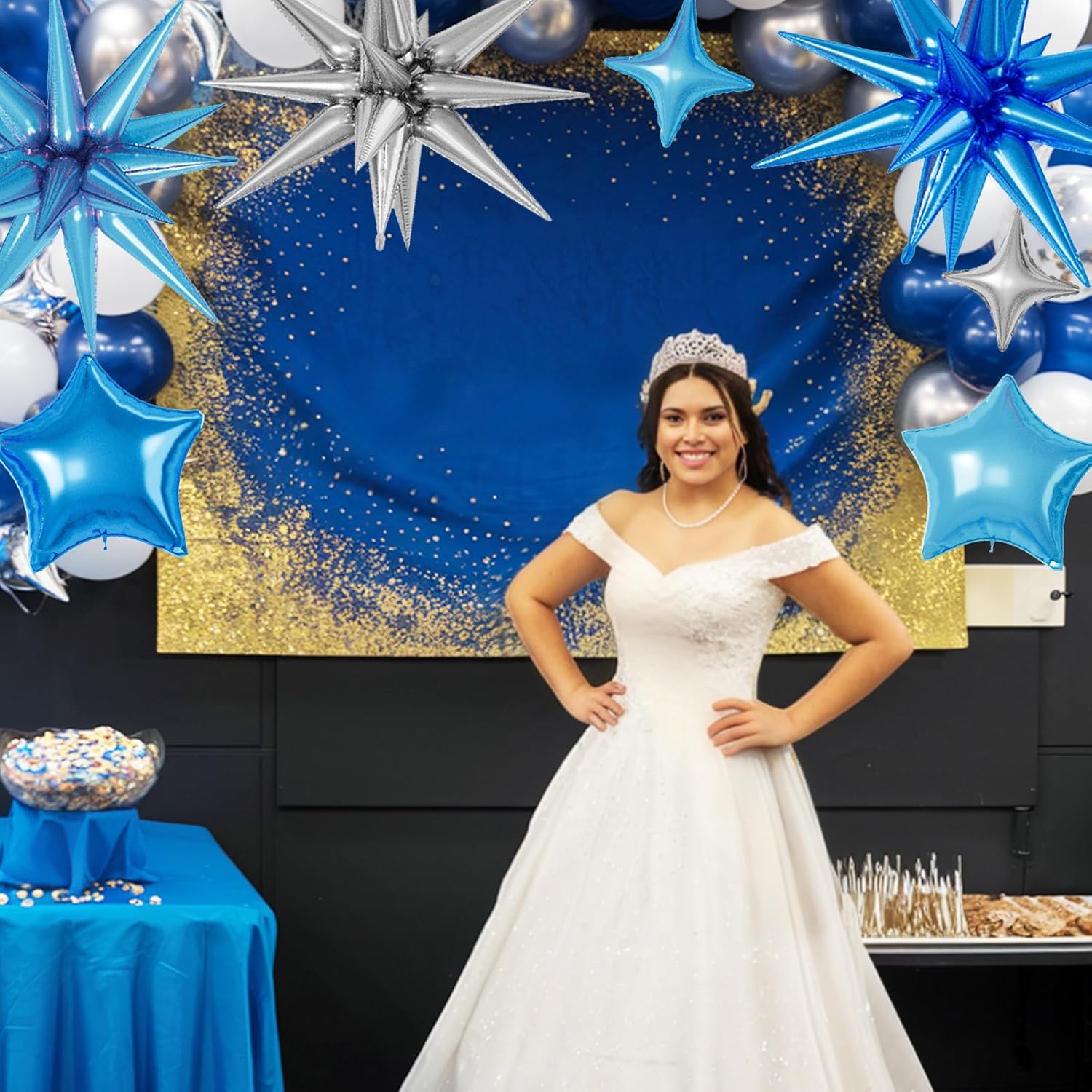 16 Pcs Blue Silver Star Balloons, 22/18/10 Inch Foil Balloons, Four-Pointed Balloon for Kids Boy Men Birthday Graduation Wedding Baby Shower Party Decorations