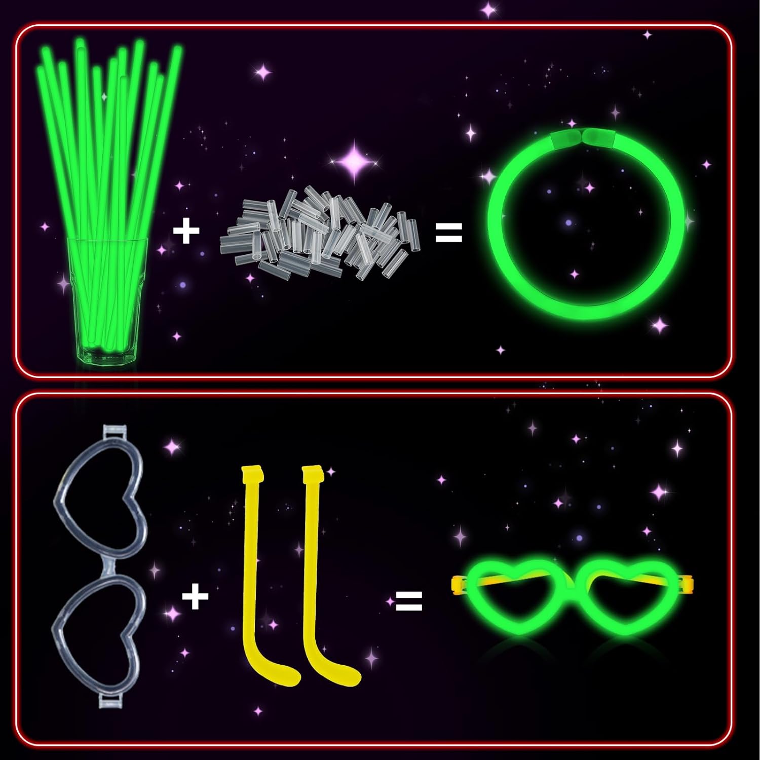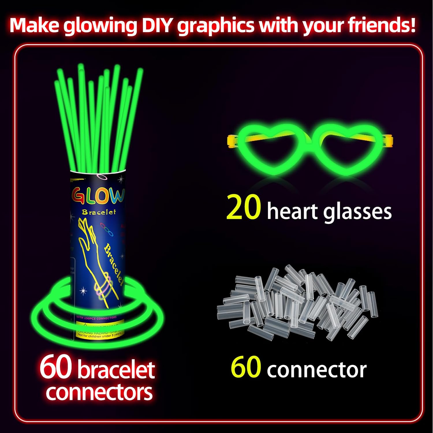• 20 Set Glow In The Dark Party Supplies: You will receive 60 glow sticks, 60 connectors and 20 heart glasses, and you can easily make 20 glow stick bracelets and 20 glow heart glasses. Have a fun evening with your friends! (Note: if only 20 glasses are made, there will be an excess of 40 connectors)
