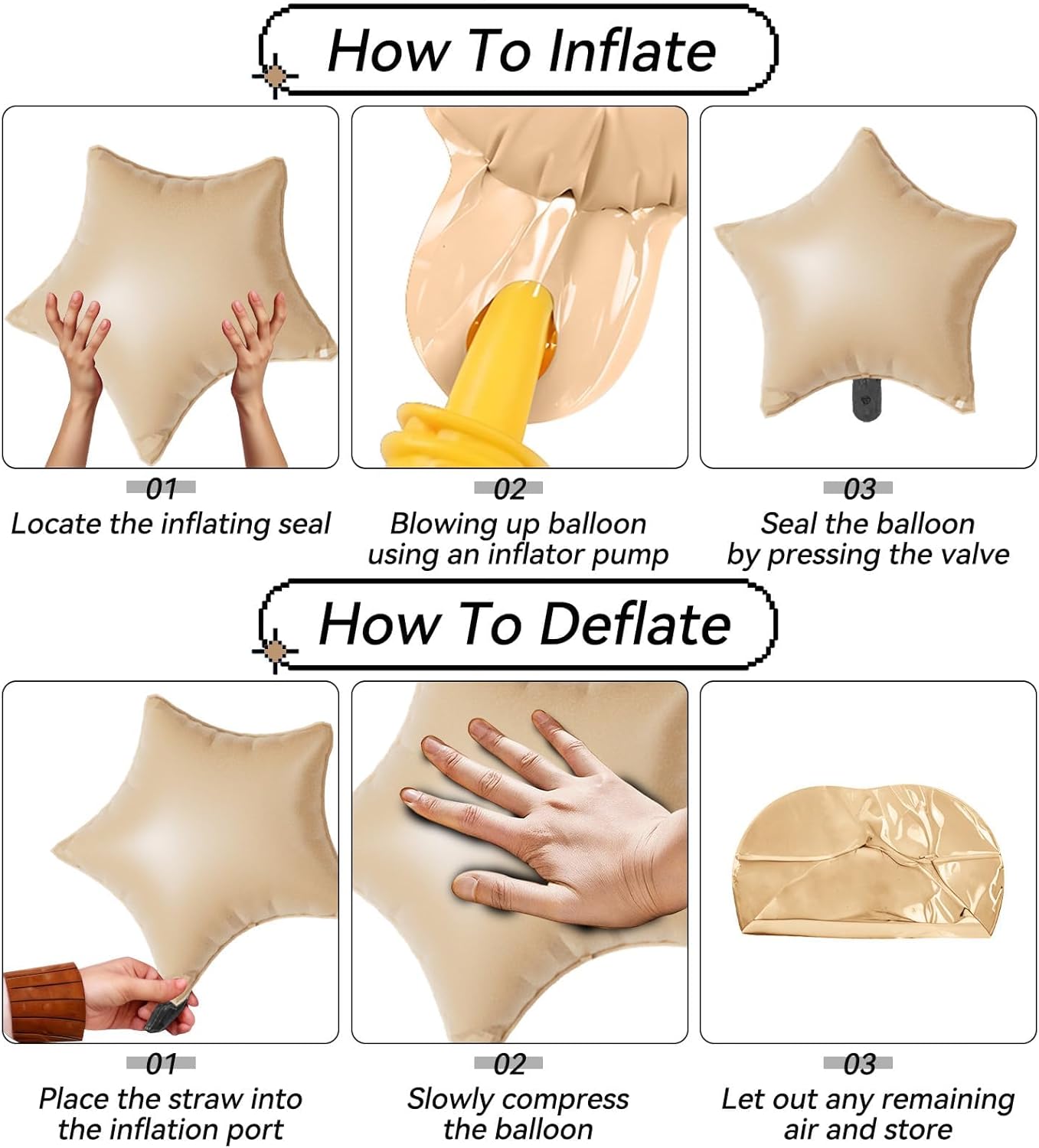 • 【Cream Caramel Brown Star Balloons】The package includes:6pcs 22-inch Star-Shape balloons(Cream*2,Caramel*2,Brown*2), 3pcs 18-inch Five-Pointed Star balloons(Cream*1,Caramel*1,Brown*1), 7pcs 10-inch Five-Pointed Star Shape balloons(Cream*3,Caramel*2,Brown*2),1 dispense and 1 straw. These foil star balloons are Great for birthdays, weddings, baby showers, and engagement parties