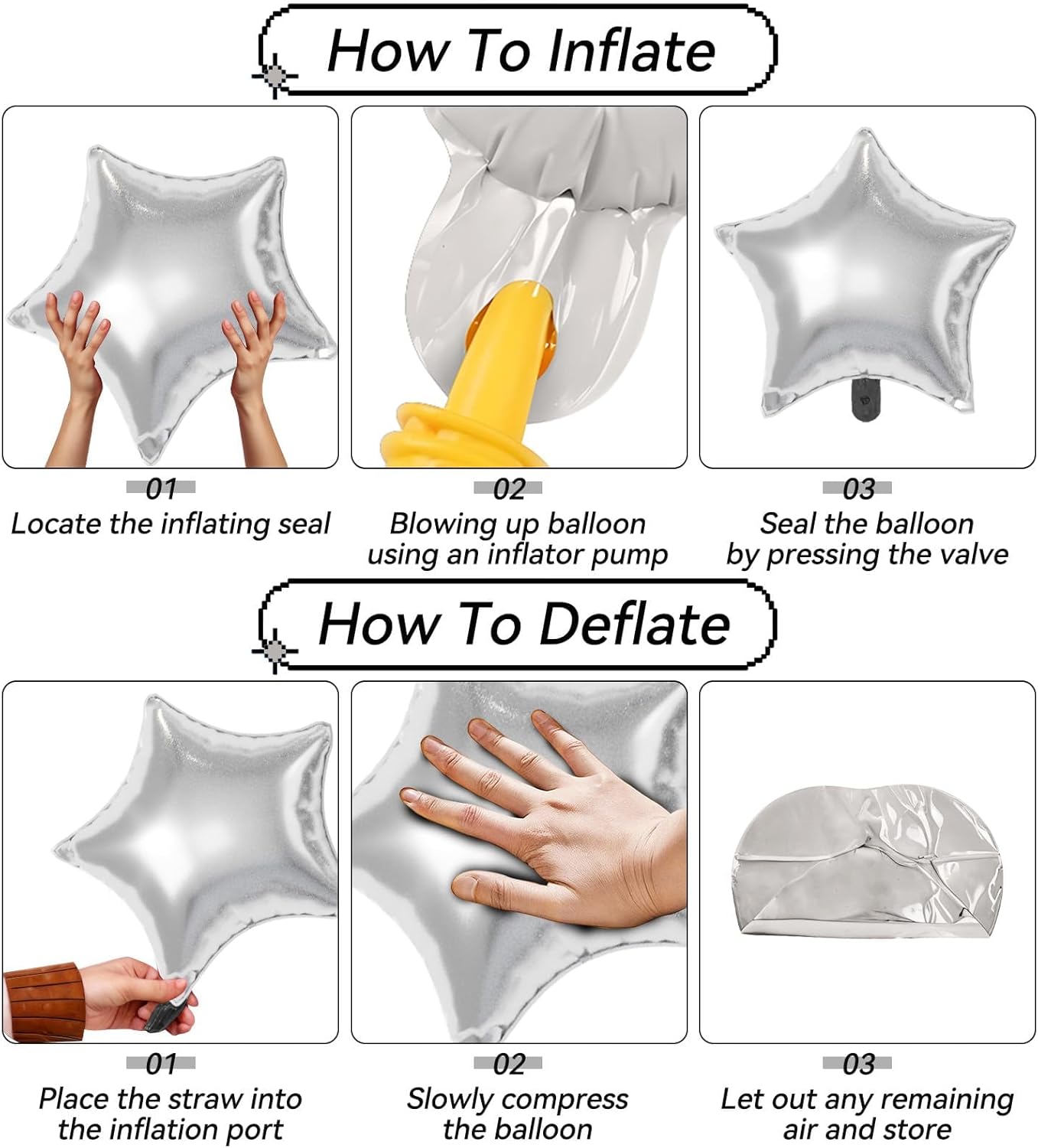 • 【Effortless Setup】Inflate with helium or air using a pump and secure easily for polished decor. These Silver Star Foil balloons are simple to assemble and reusable for multiple events, making decorating quick and effortless.