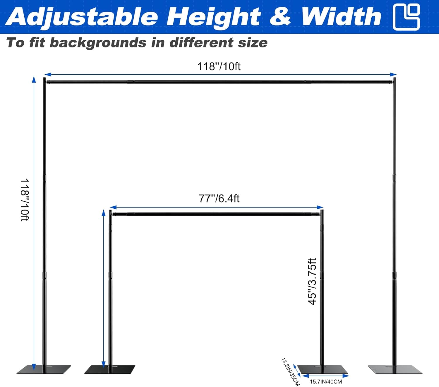 • Adjustable Size: Customizable height (from 5.6 ft to 10 ft) and width (from 5.6 ft to 10 ft) to suit various backdrop sizes and applications.