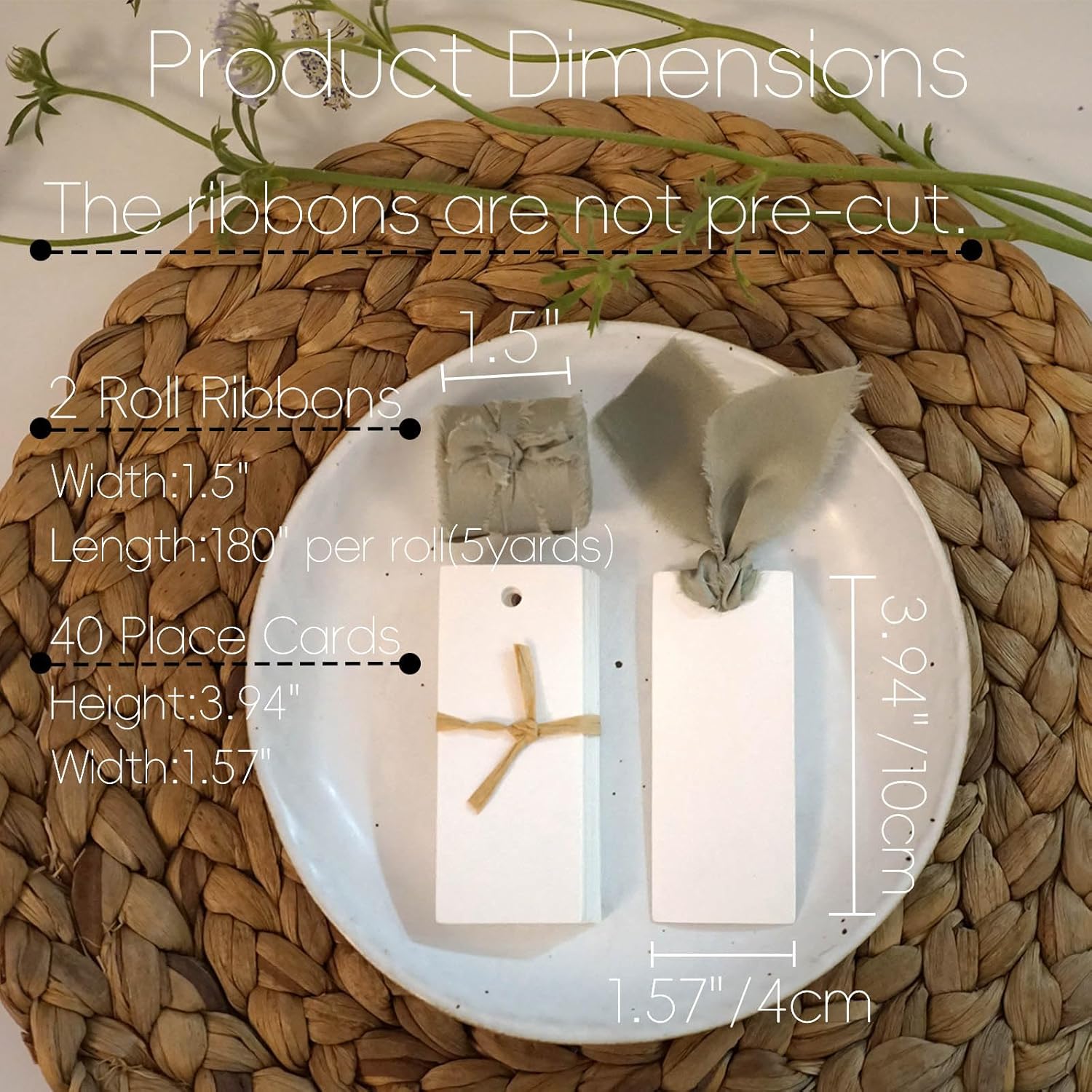 • What You Get: 40 pcs 3.94"x1.57"place cards, 2 rolls of 1.5"x180"ribbons .The ribbons are not pre-cut.You can cut them to 8 inches each,or cut them to suit your personal needs to better match the occasion