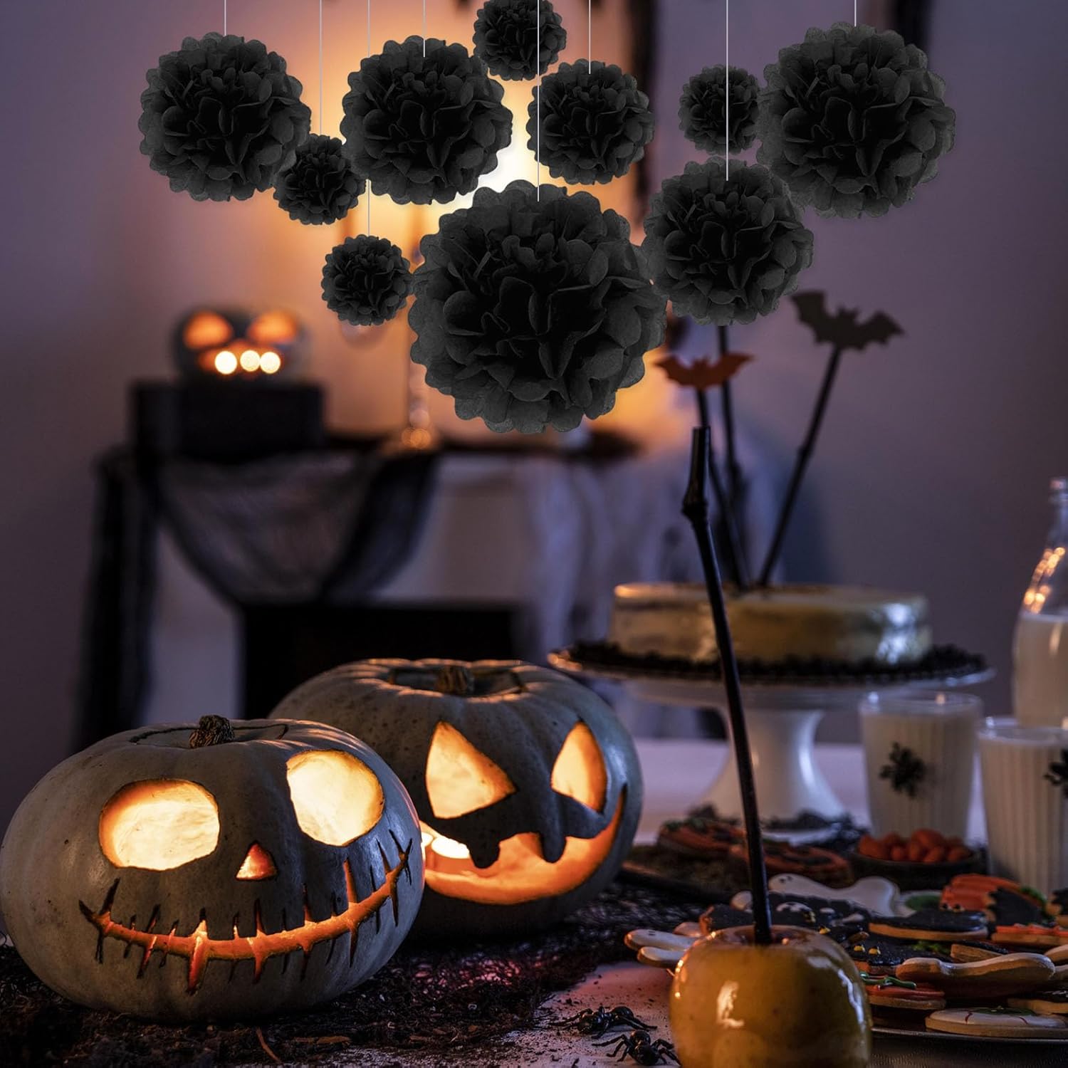 • 【Large Set】20 Pieces black paper flower balls include 6 of 6-inch, 6 of 10-inch, 5 of 12-inch, and 3 of extra-large 14 inch paper pom pom flowers.