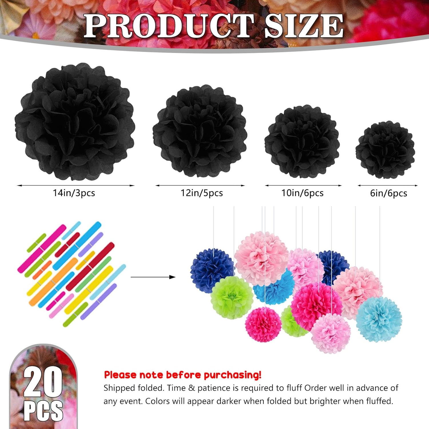 Tissue Paper Pom Poms, Black Tissue Paper Flowers, Hanging Flower Balls for Weddings Fiesta Parties Birthday Baby Showers Classroom Bridal Shower Decoration (20Piece Set-6/10/12/14Inch)