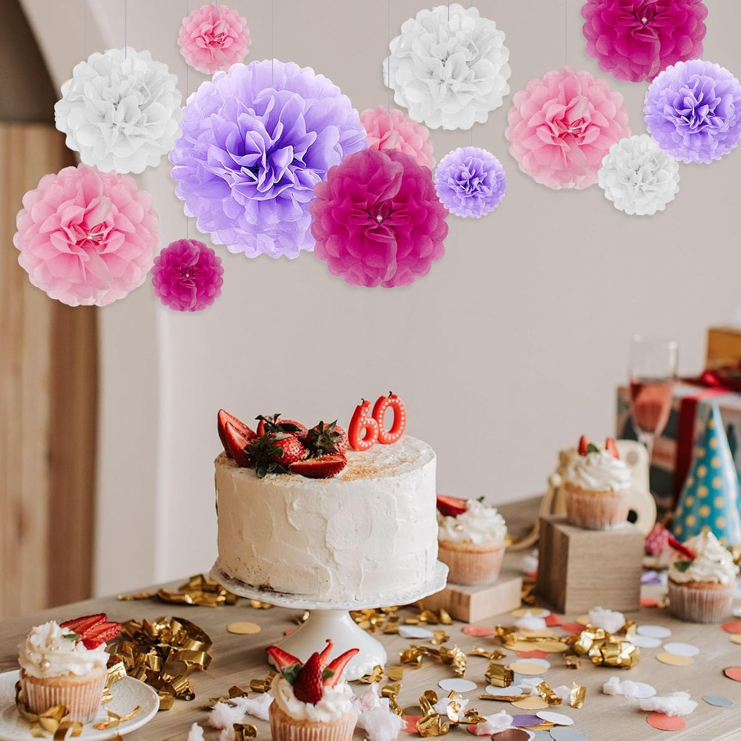 Tissue Paper Pom Poms, Purple Pink White Tissue Paper Flowers, Hanging Flower Balls for Weddings Fiesta Parties Birthday Baby Showers Classroom Bridal Shower Decoration (20Piece Set-6/10/12/14Inch)