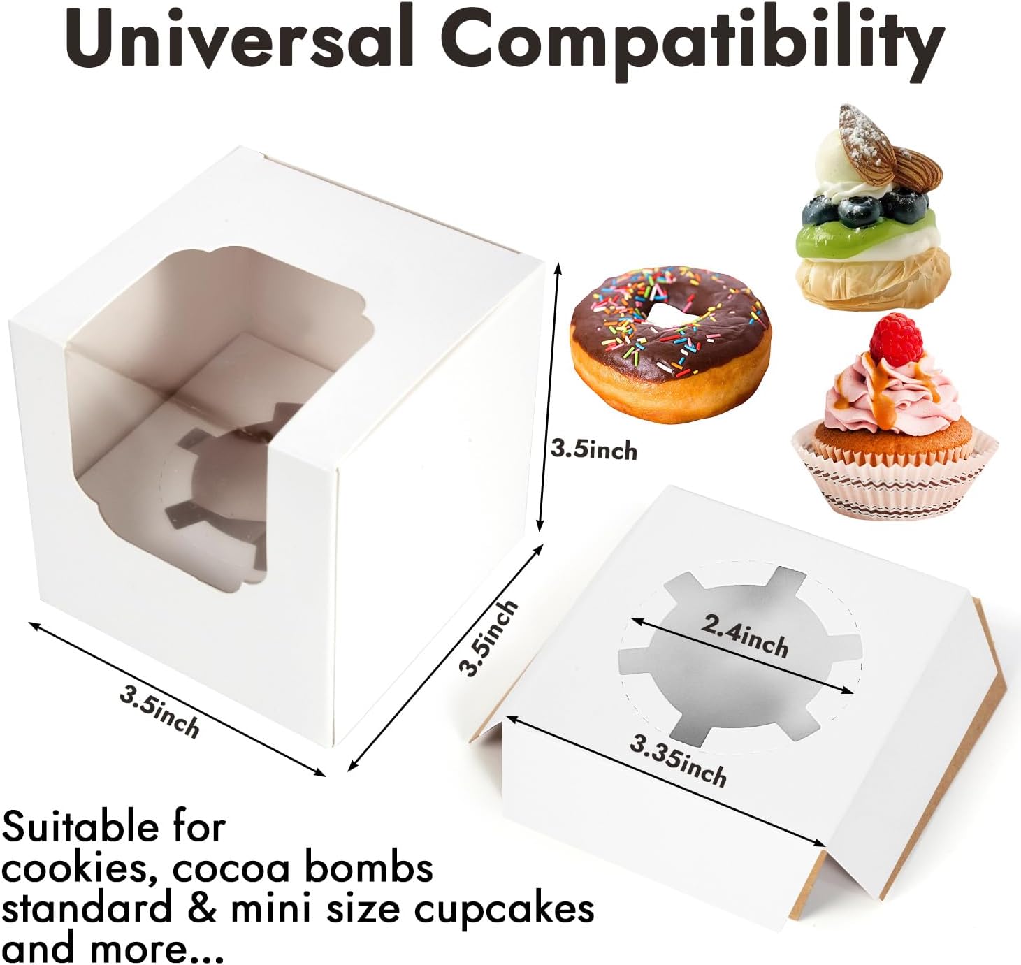 • Package Contents - Each package includes 70 cupcake boxes and 70 cupcake inserts. The assembled cupcake box measures 3.5" x 3.5" x 3.5", while the insert dimensions are 3.4" x 3.4" x 1". The boxes and inserts are designed to fold flat, allowing for convenient storage.